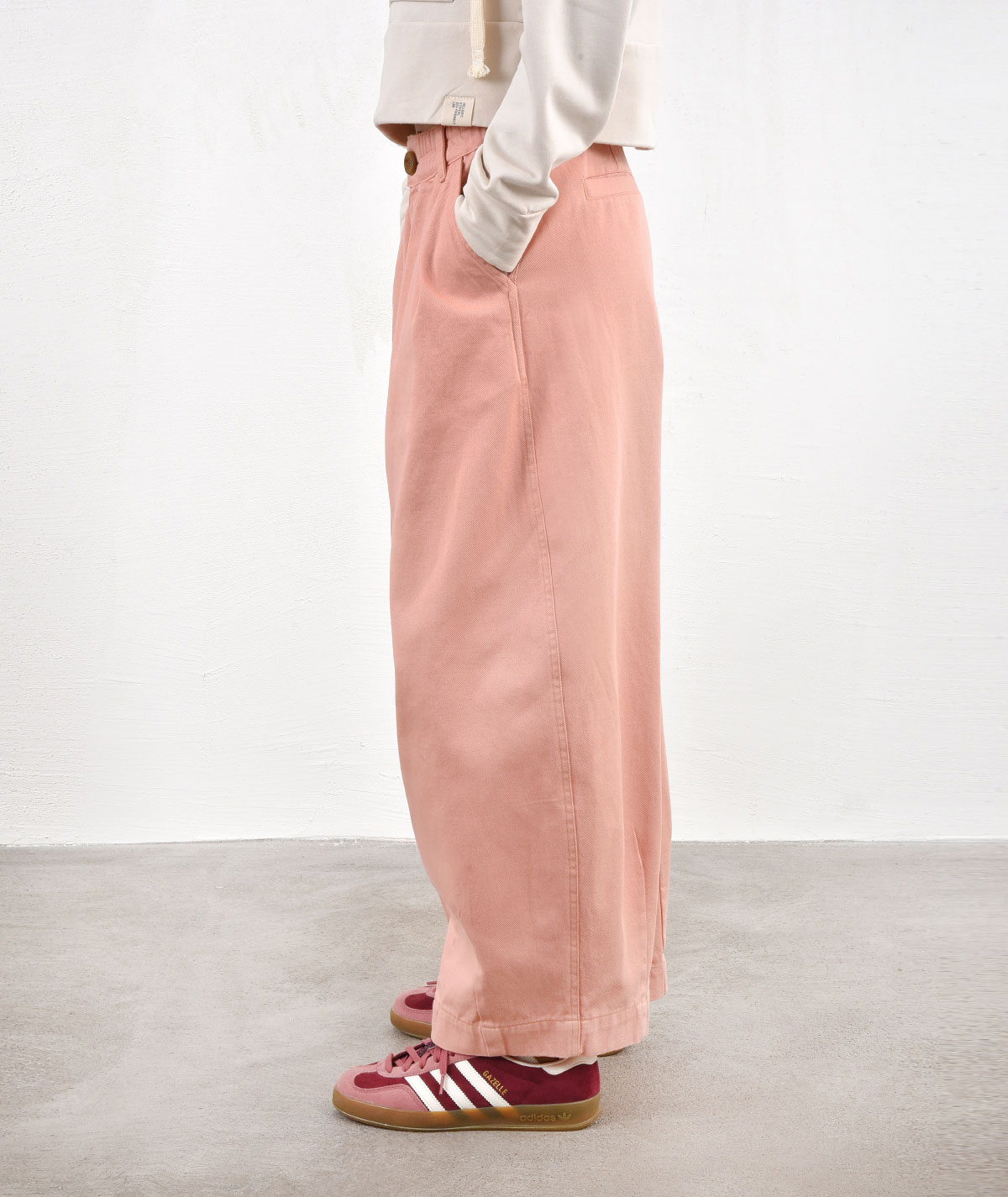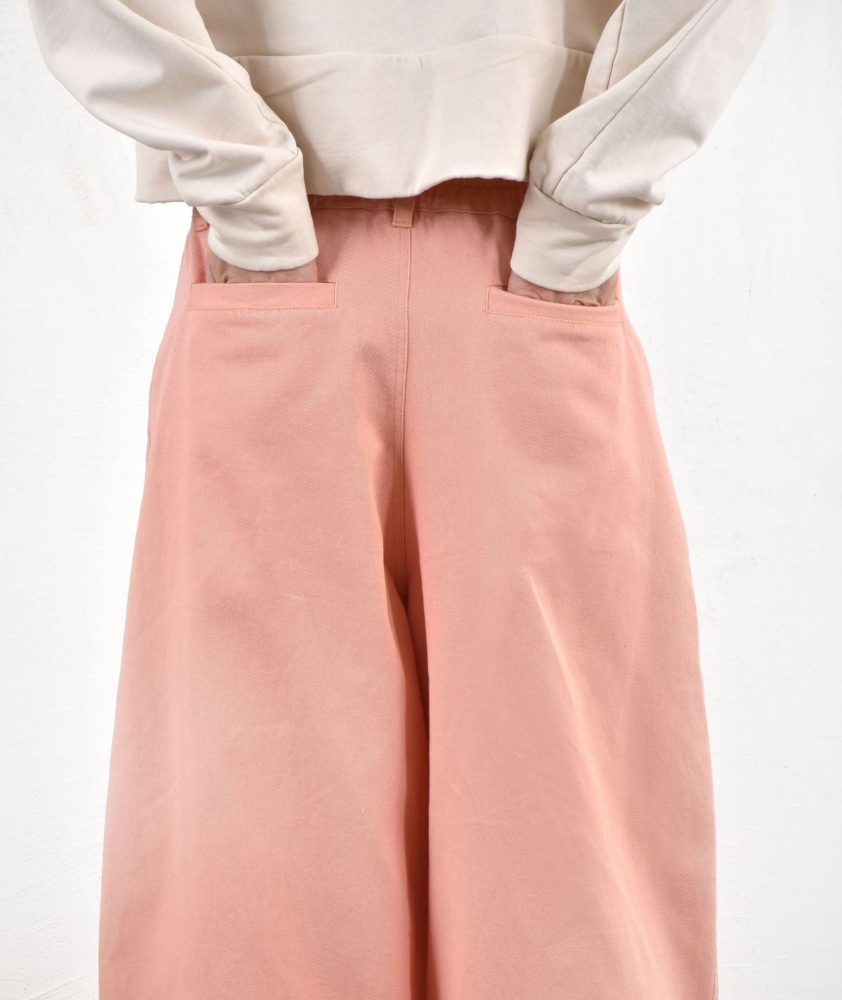 Γυναικείο παντελόνι με σχεδιαστικές πιέτες, τσέπες στο πλάι και στο πίσω μέρος, κούμπωμα μπροστά και λάστιχο στη μέση από απαλό βαμβακερό ύφασμα. Συνδύαστε το εύκολα με sneakers ή σανδάλια, καθώς και με τις μπλούζες και τα κιμονό της συλλογής για ένα μοναδικό street style look.