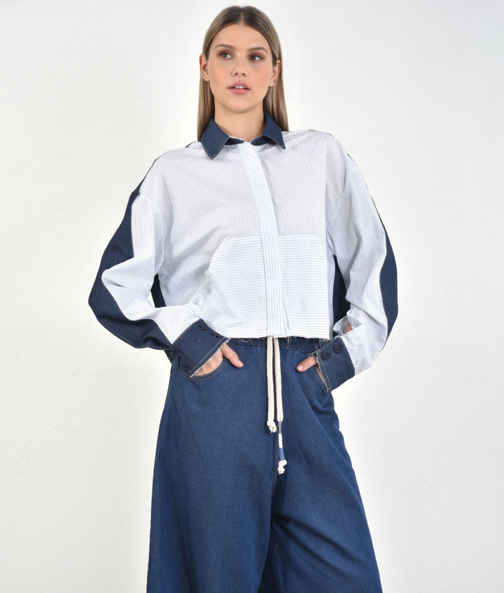 A women's crop shirt in a combination of fabrics with long sleeves and denim back and a collar made of cotton fabric. A special design that combines denim with the office look ideal for all hours of the day. Combine it perfectly with denim pants and sneakers for an ultra-stylish outfit.