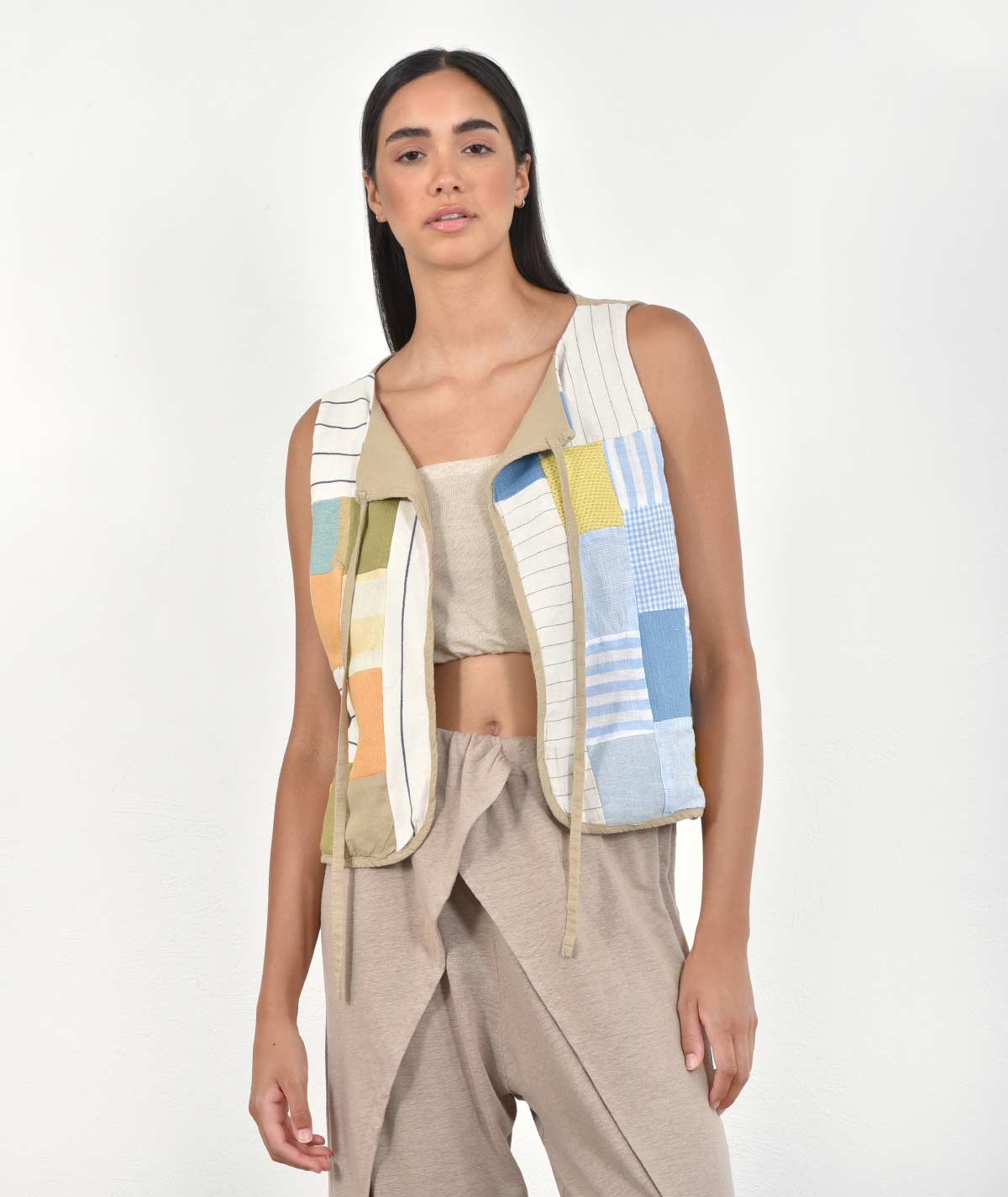 A women's vest in a cotton-linen combination with a drawstring fastening on the front. A unique hand-made patchwork design that joins exceptionally the fabric pieces on the front, keeping a breezy linen fabric in a soft earth tone on the back for easy outfits. Combine it perfectly with the pants of the collection and enjoy your summer vacations in style.