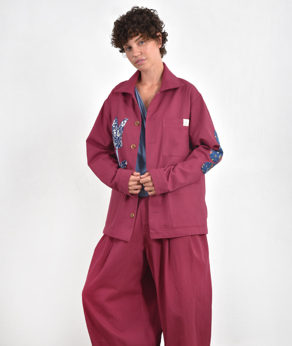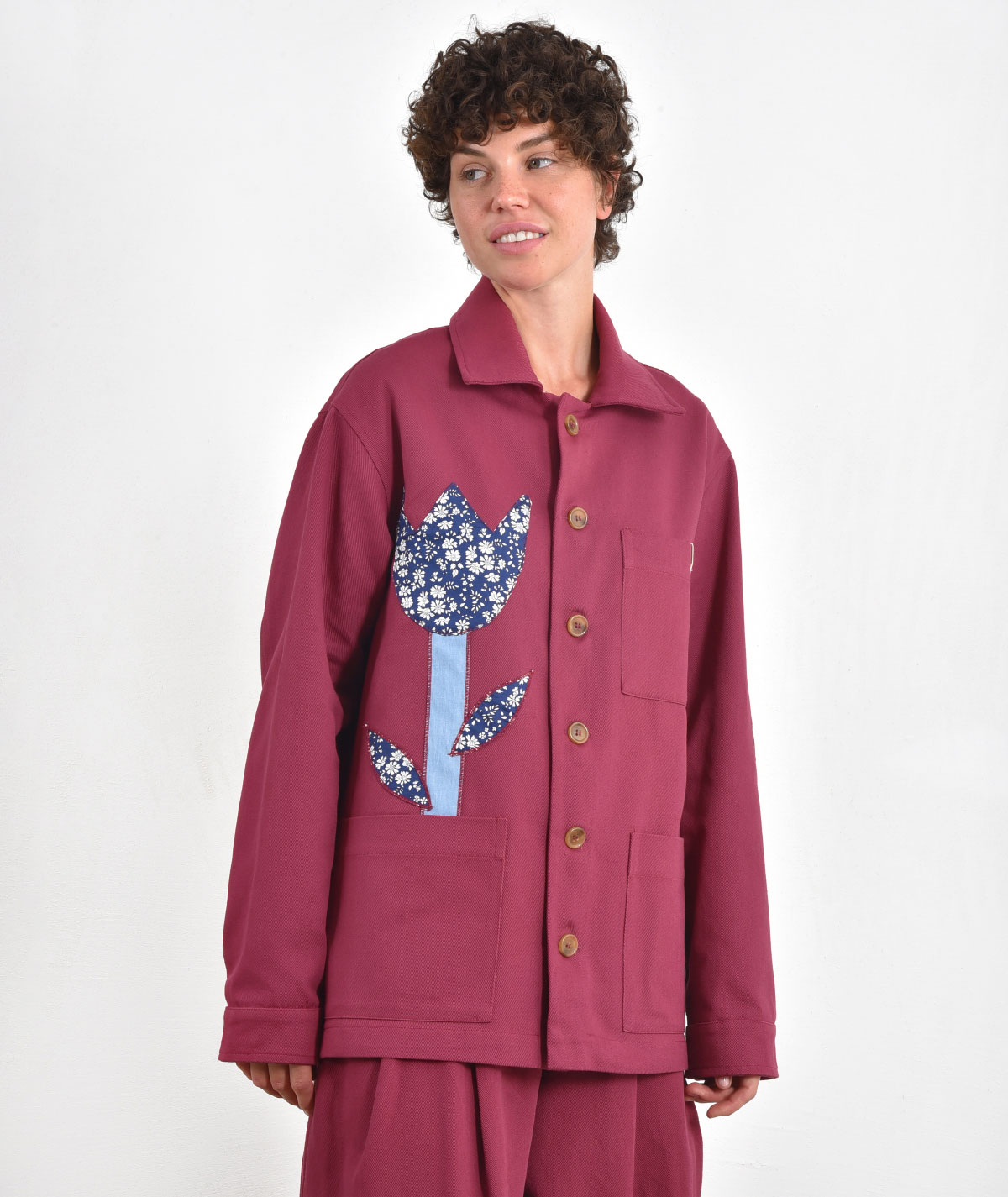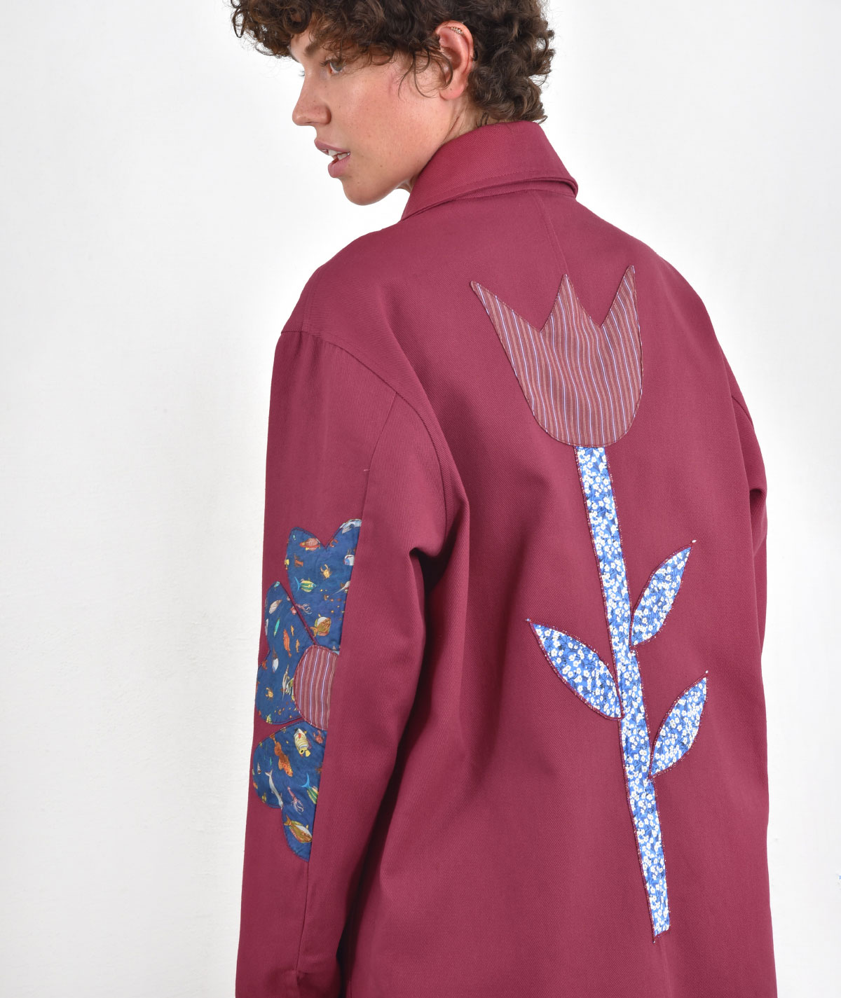 Unisex jacket crafted from premium cotton canvas, adorned with bold appliqué flowers, each hand-cut and hand-placed using leftover fabric remnants. Designed and handmade in our studio in limited quantities, it offers style, comfort, and a true statement aesthetic. A standout piece that elevates any outfit—from casual looks to more refined ensembles.