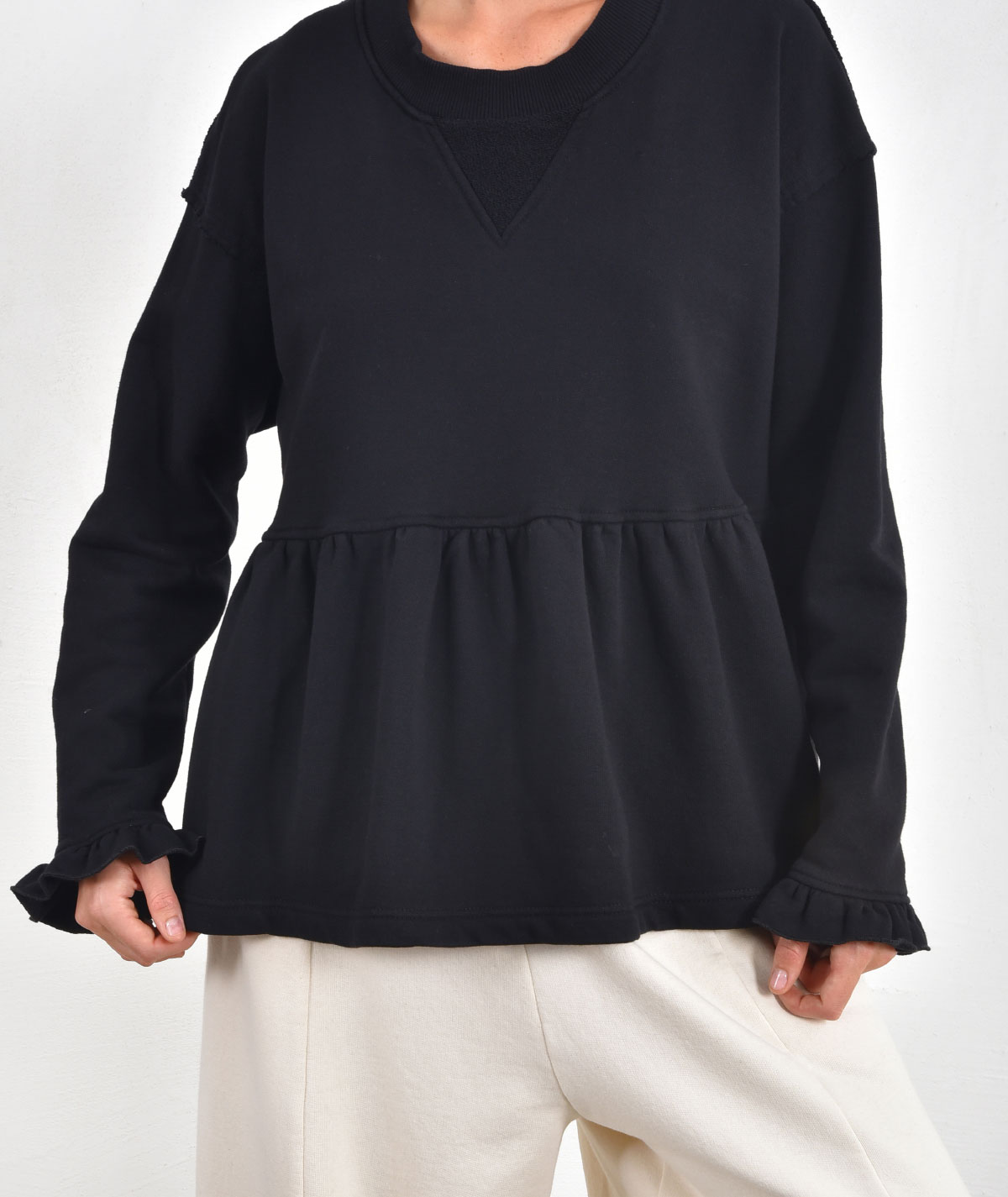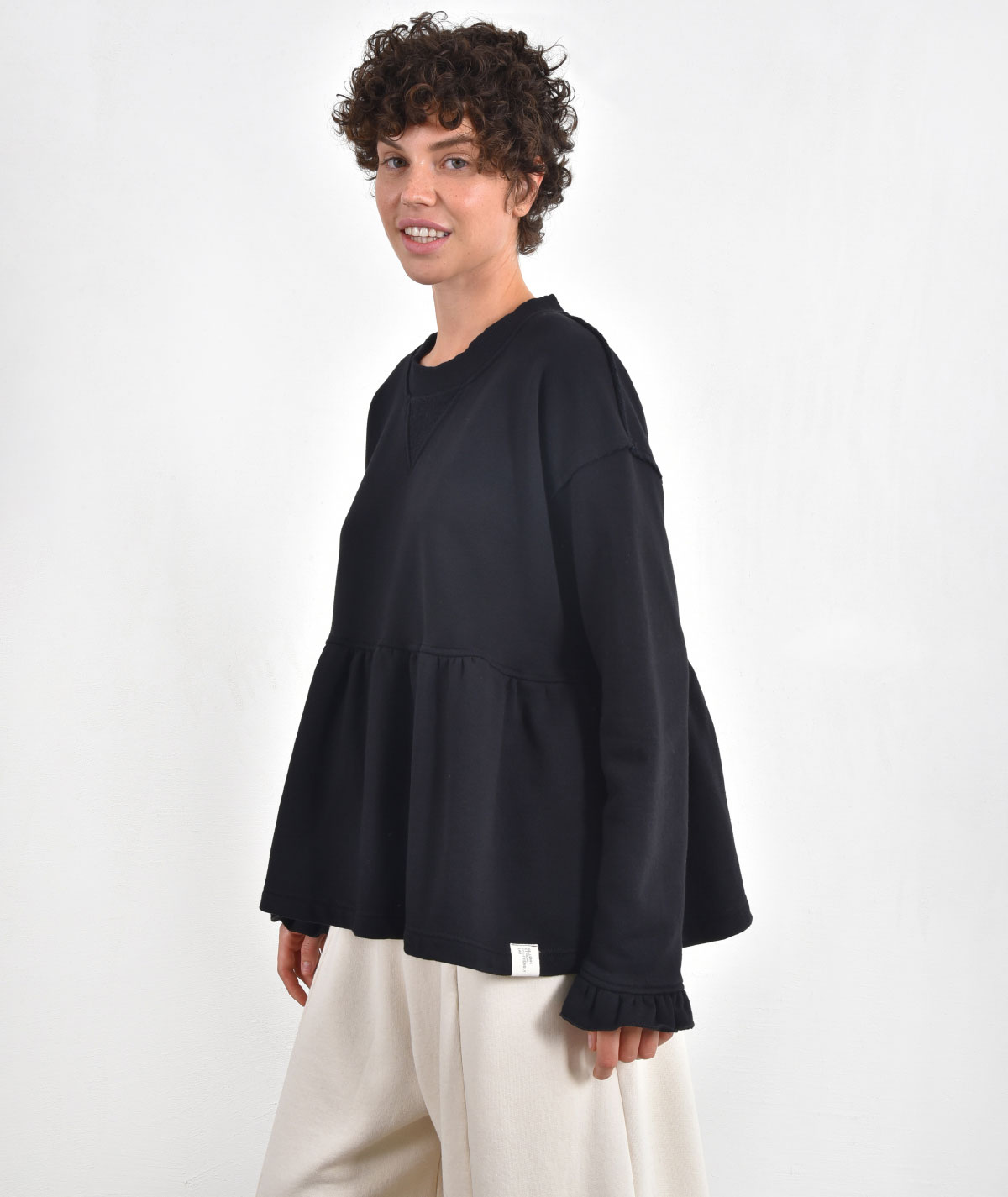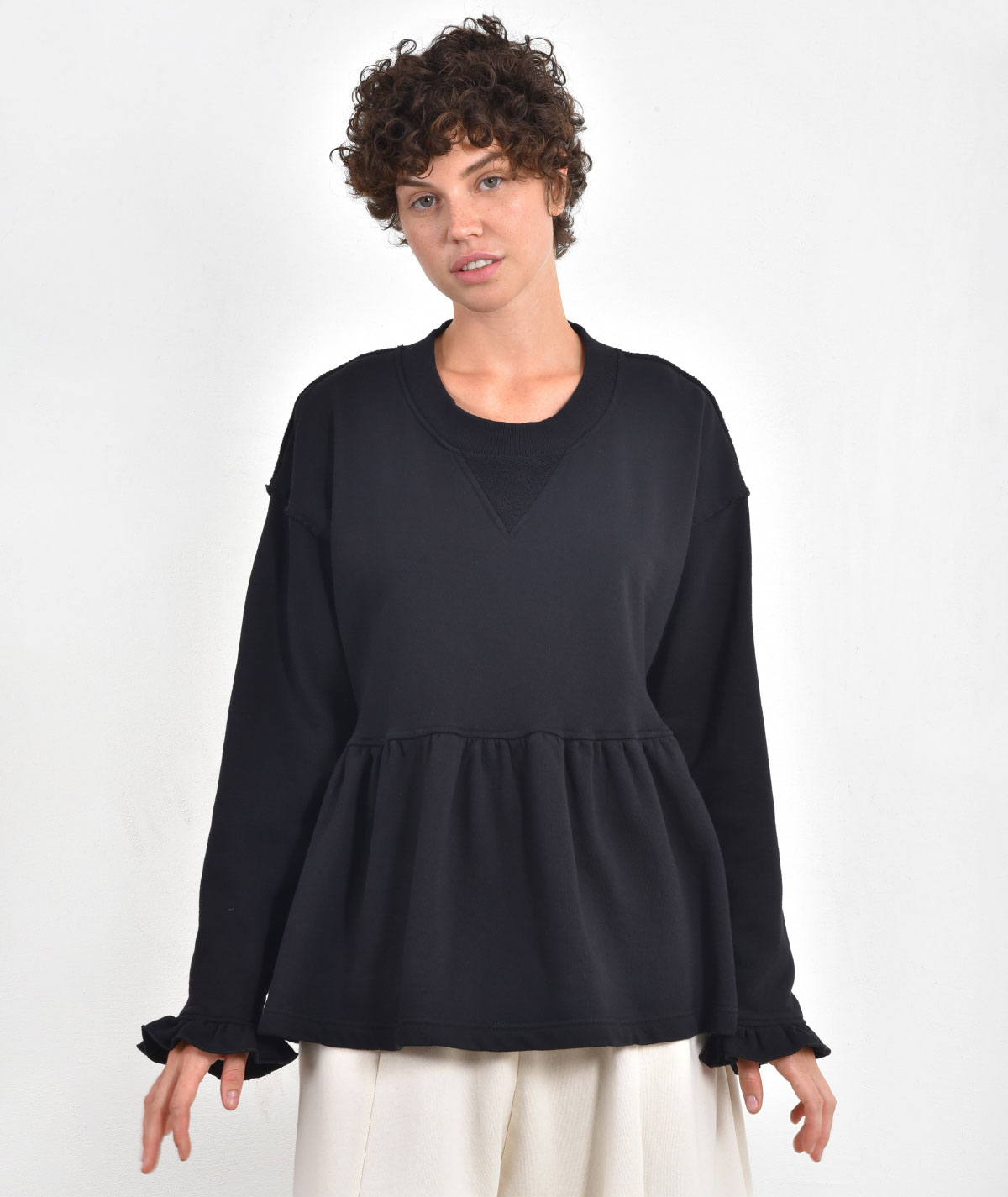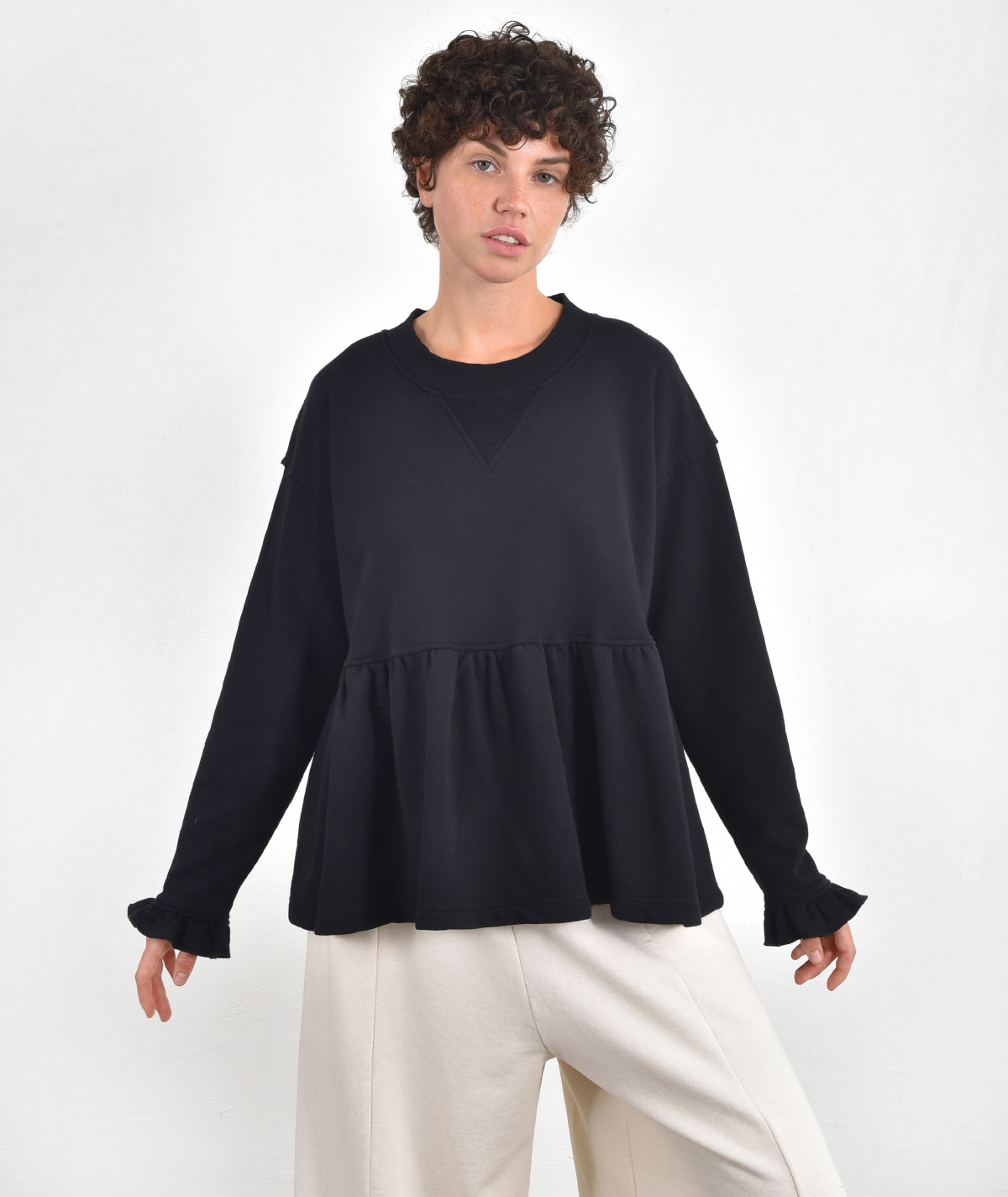 Oversized ruffle blouse made from 100% cotton.