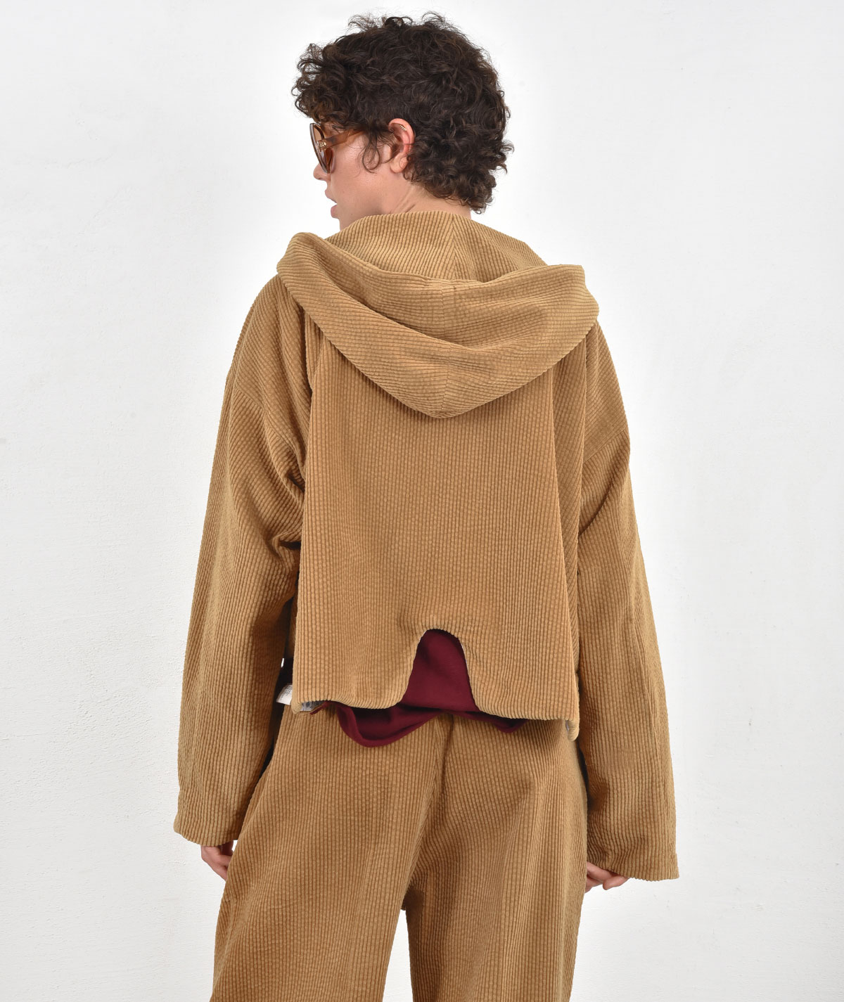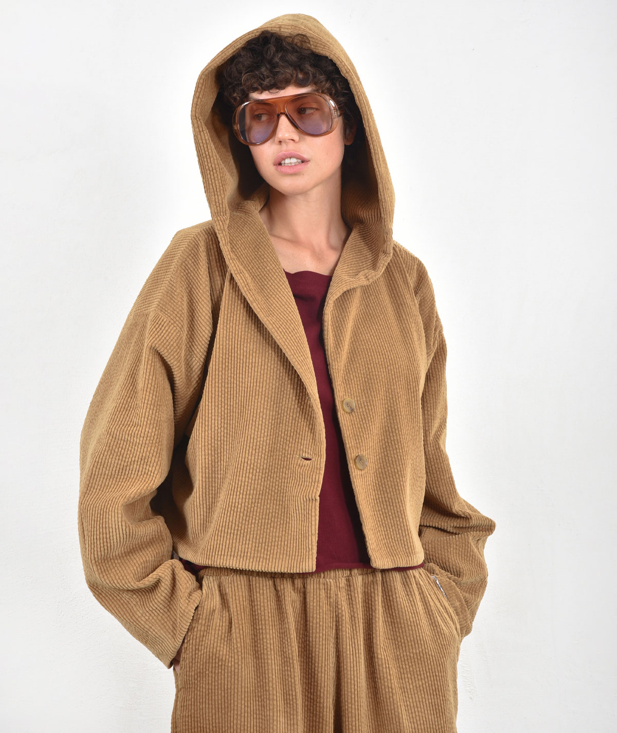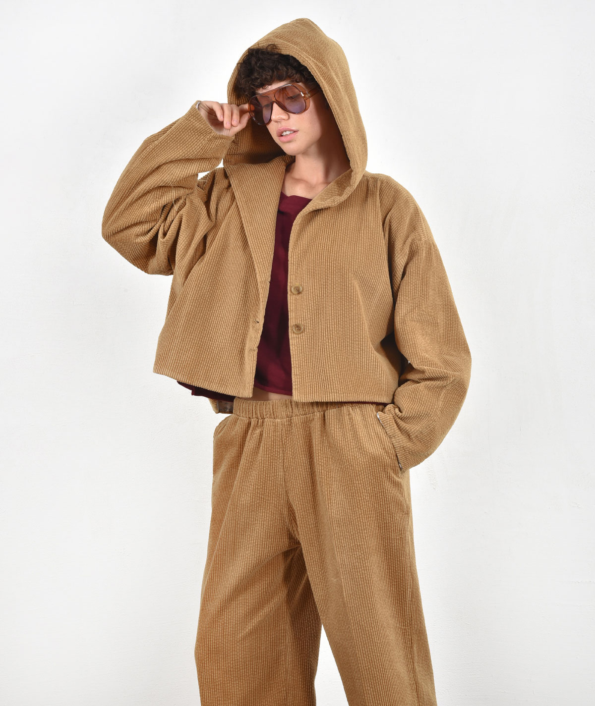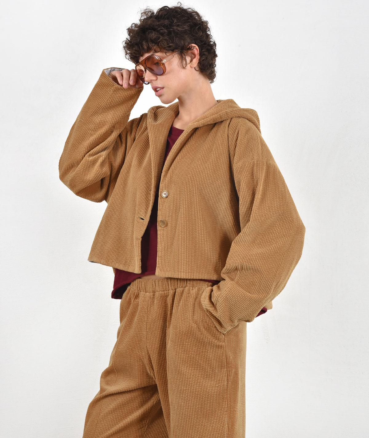 Discover the corduroy jacket with hood, made from 100% cotton for a natural feel and all-day comfort. Its cropped length and relaxed fit offer a modern, effortless style, while the unique back detail adds a distinctive touch that sets it apart. Pair it with the matching corduroy trousers from the collection for a complete, chic look.