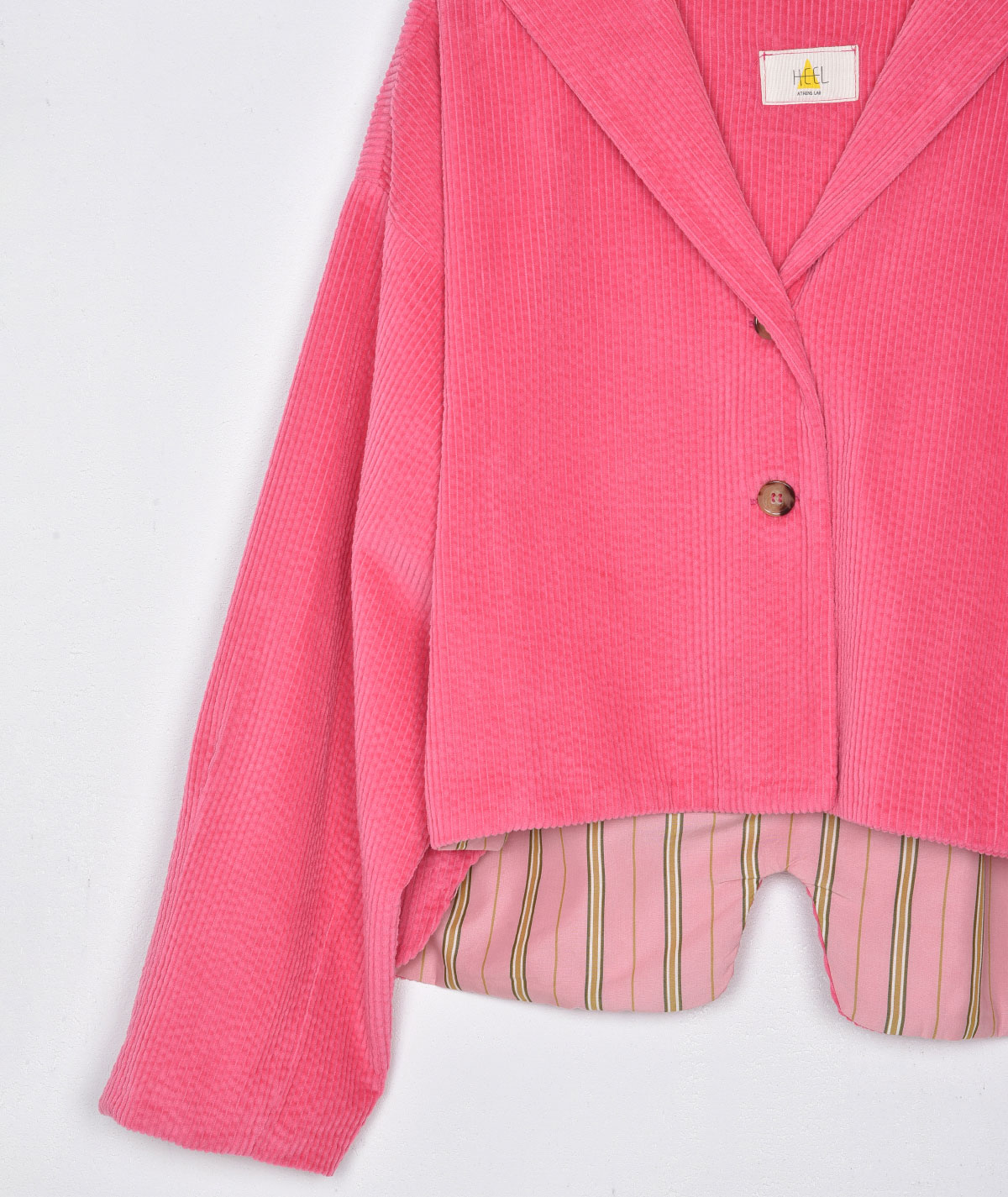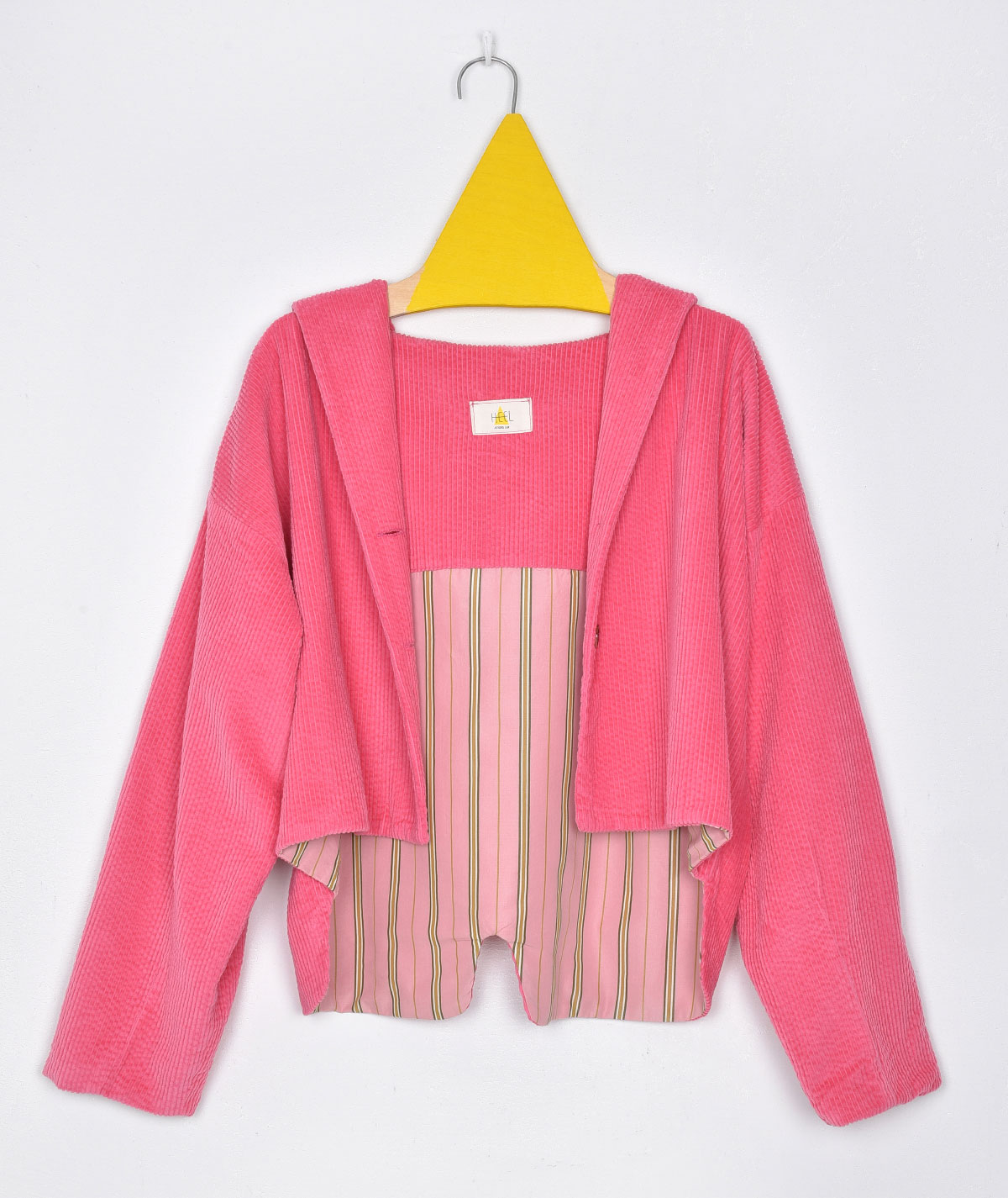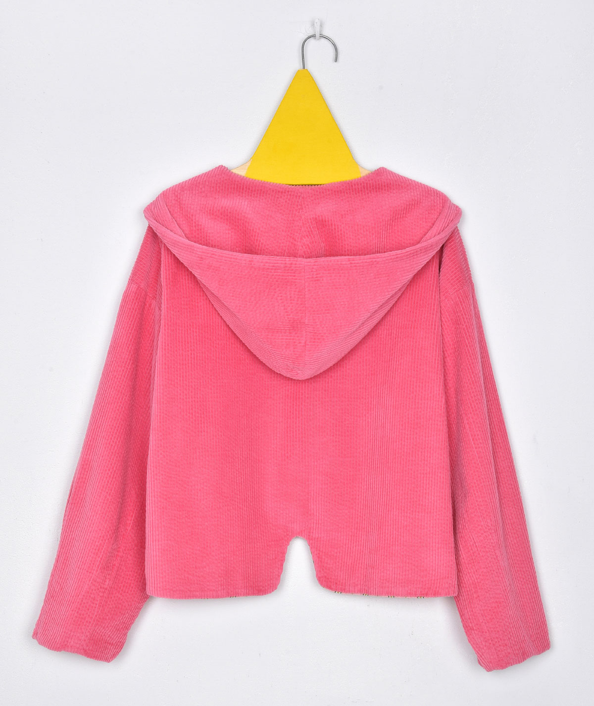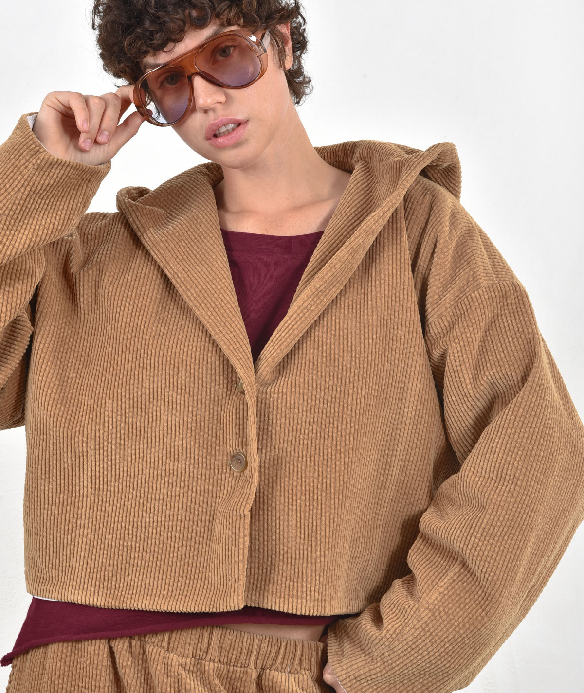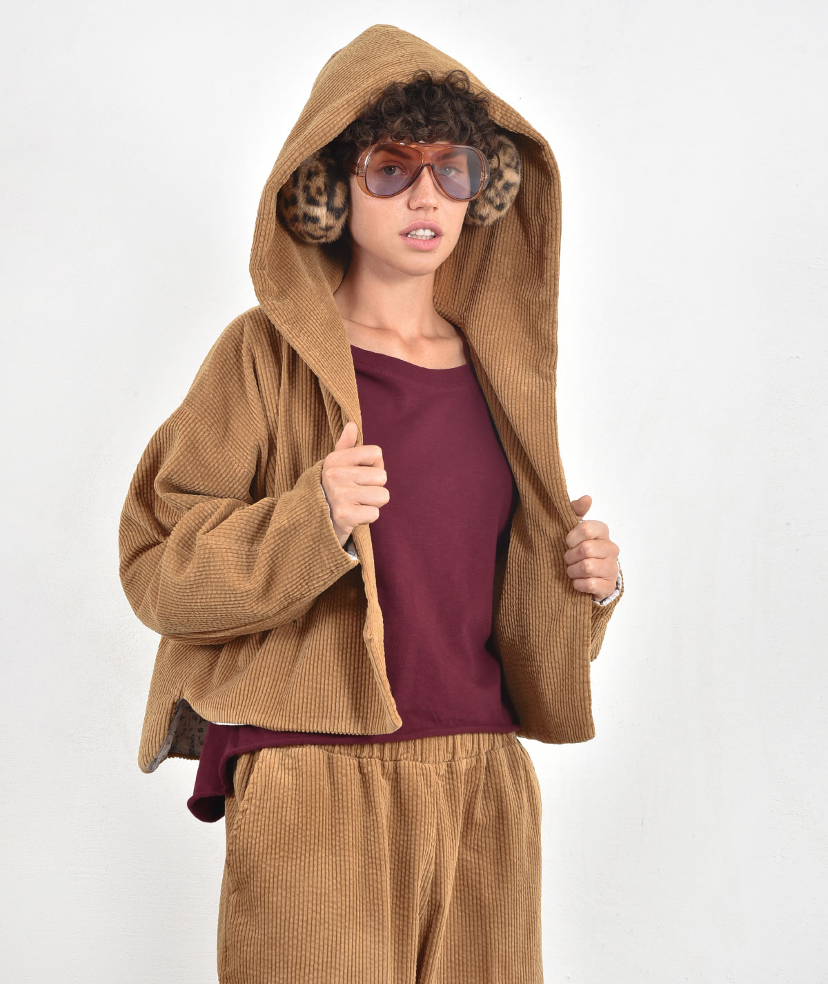Discover the corduroy jacket with hood, made from 100% cotton for a natural feel and all-day comfort. Its cropped length and relaxed fit offer a modern, effortless style, while the unique back detail adds a distinctive touch that sets it apart. Pair it with the matching corduroy trousers from the collection for a complete, chic look.