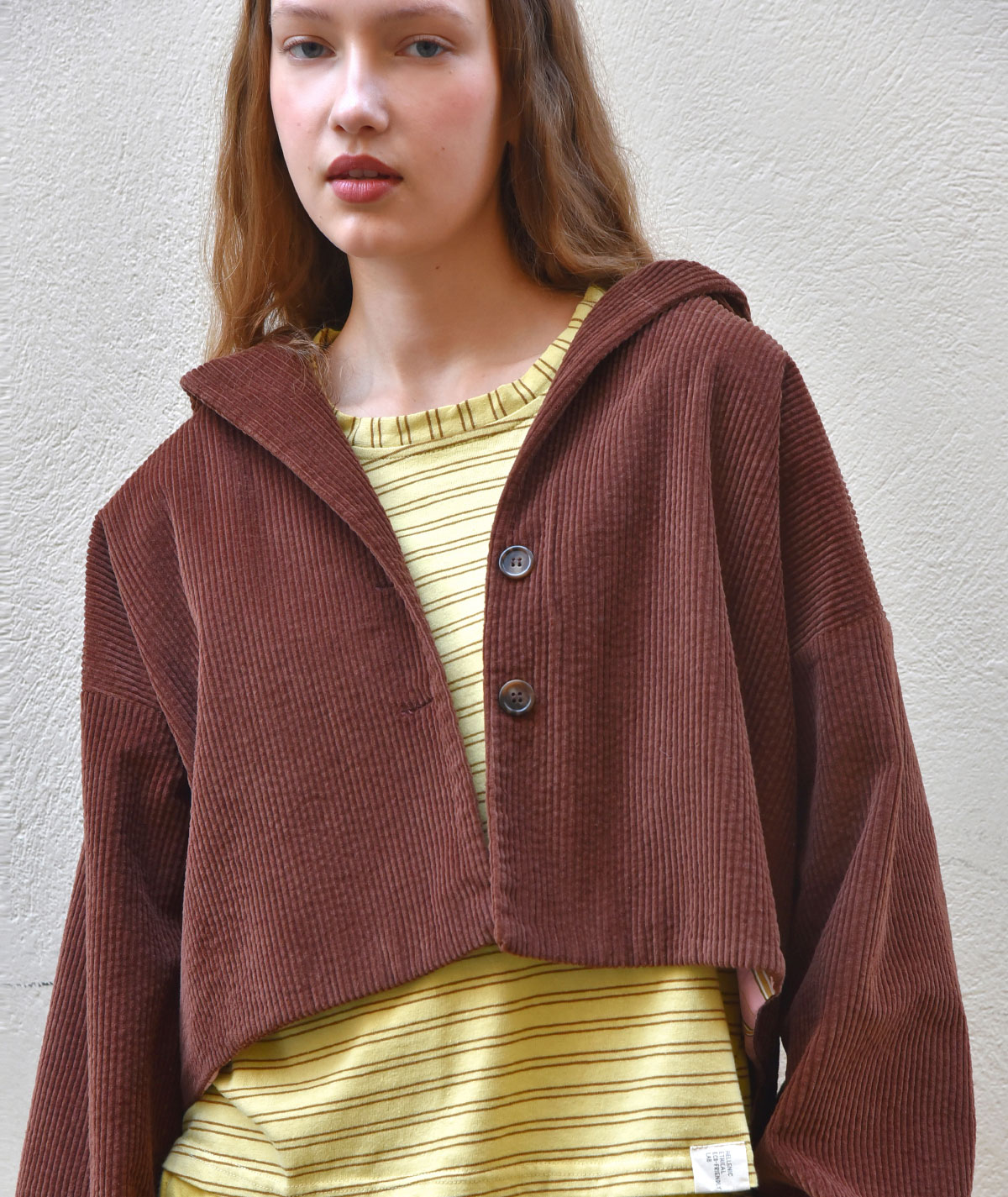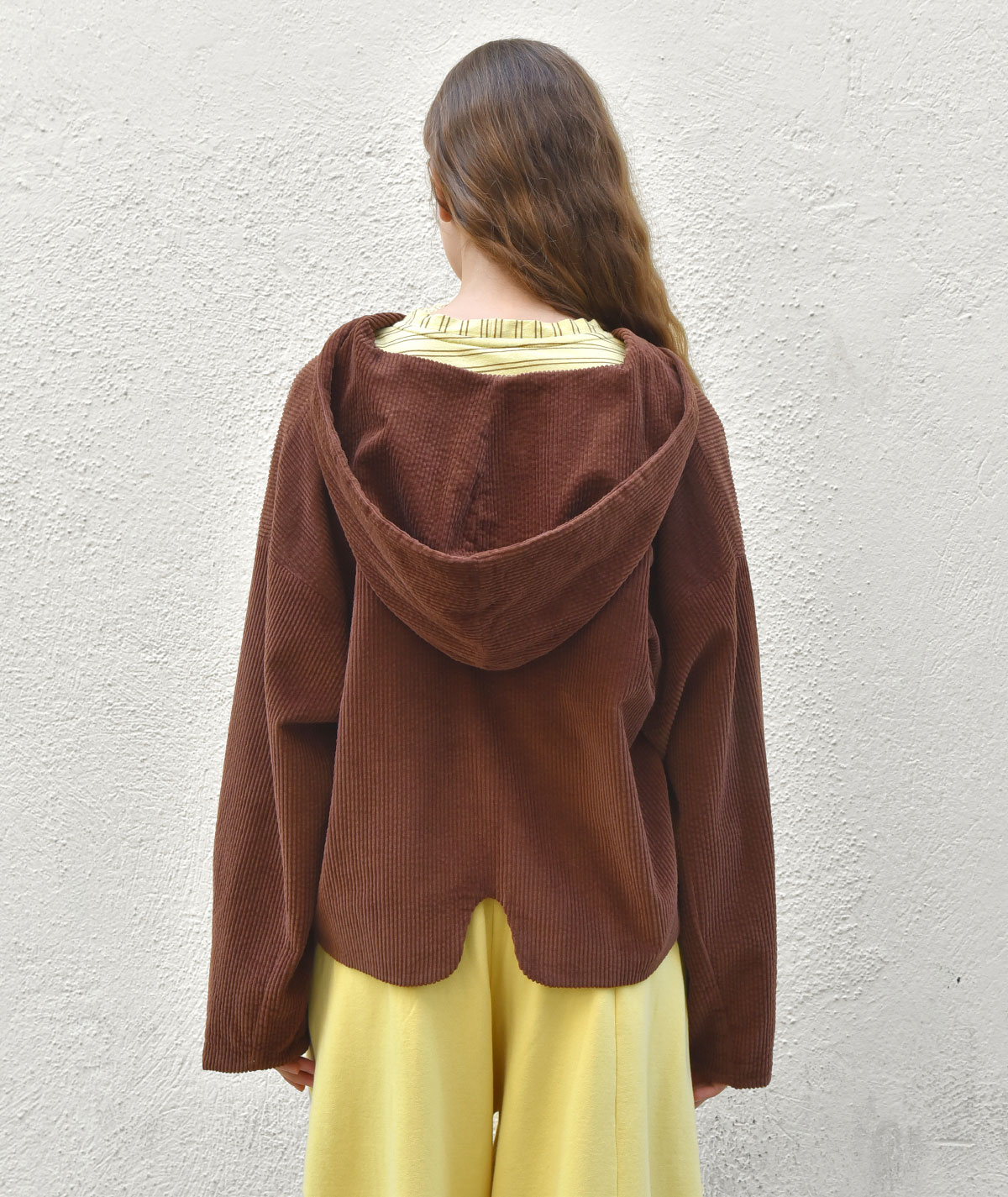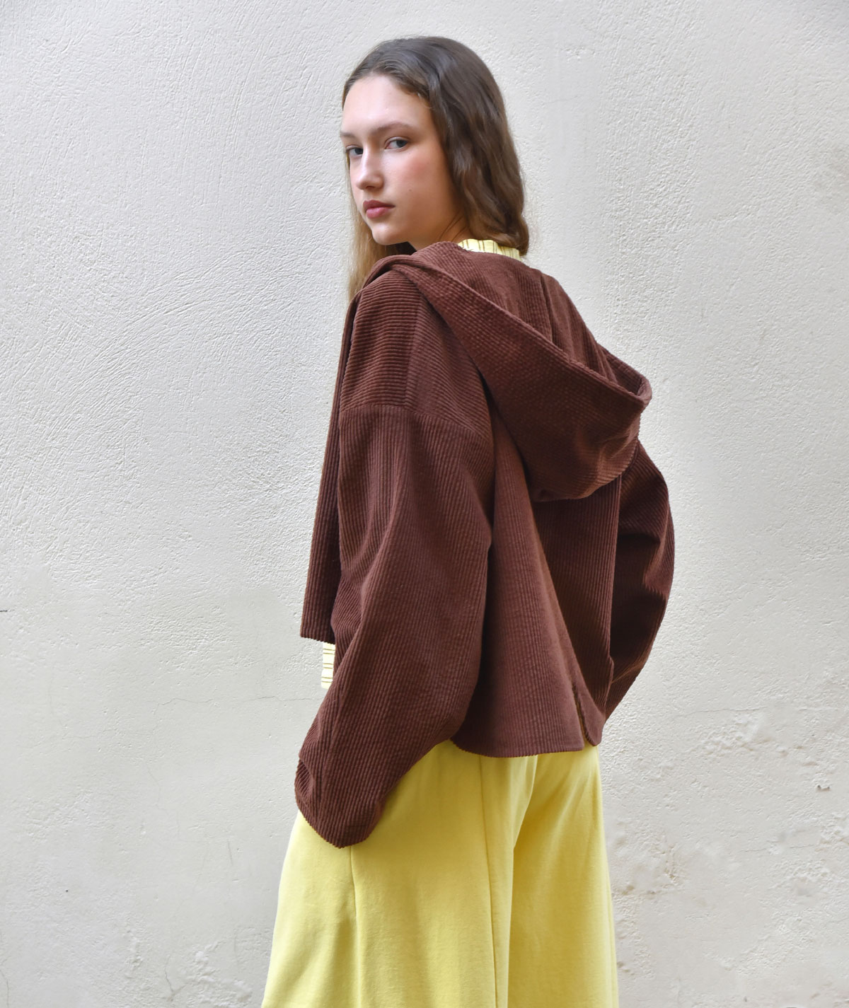 Discover the corduroy jacket with hood, made from 100% cotton for a natural feel and all-day comfort. Its cropped length and relaxed fit offer a modern, effortless style, while the unique back detail adds a distinctive touch that sets it apart. Pair it with the matching corduroy trousers from the collection for a complete, chic look.