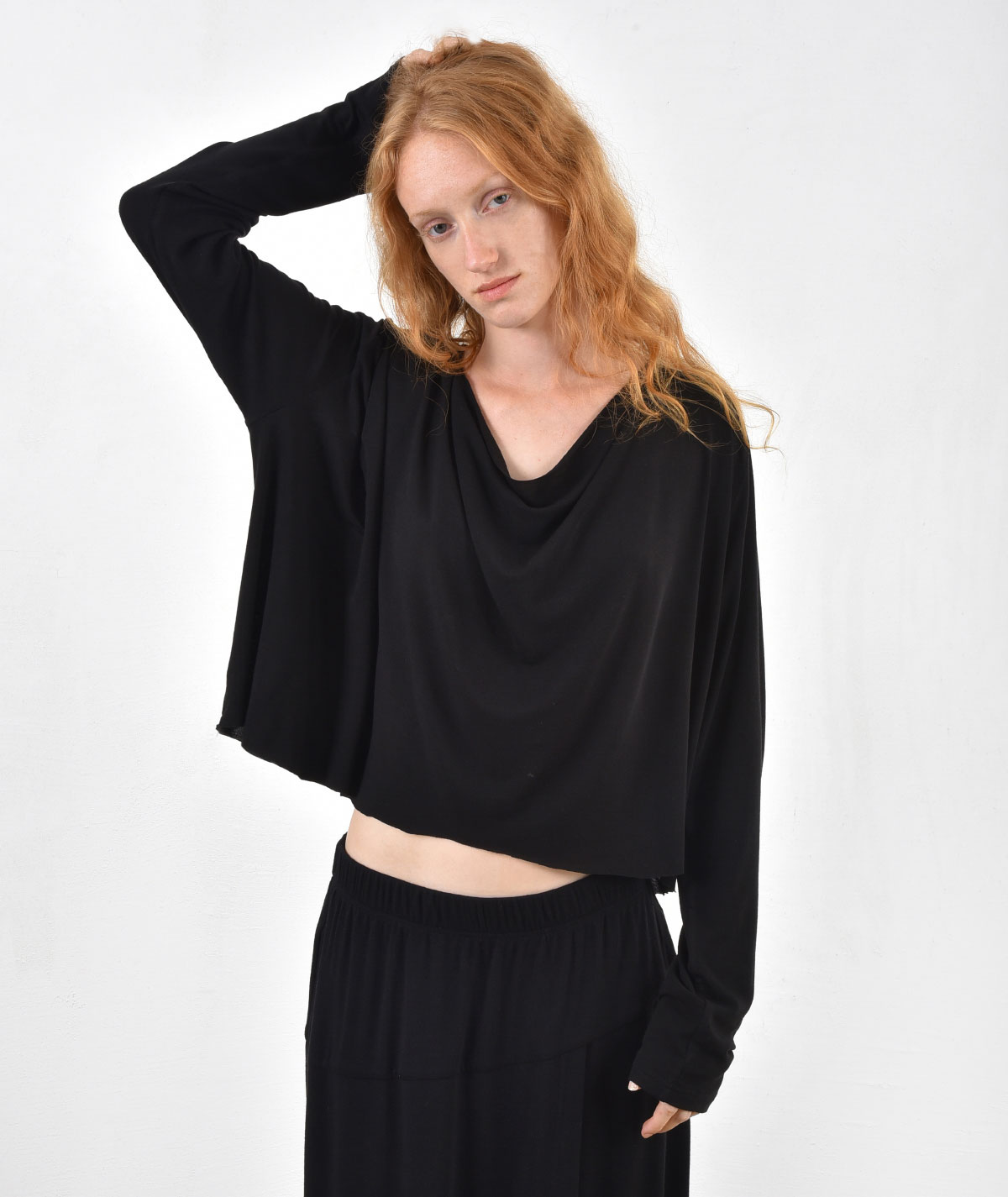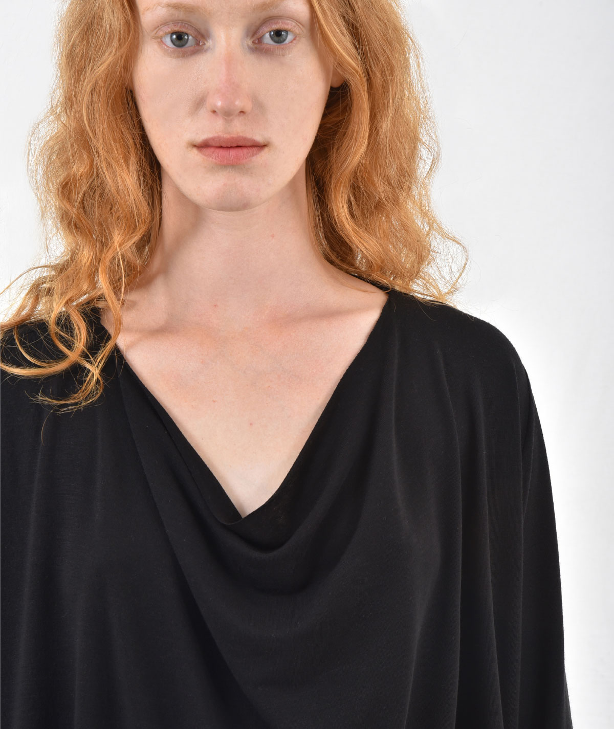 Discover the ultimate piece for effortless style. This draped blouse, made from 73% Tencel and 19% wool, stands out for its soft texture and natural fluidity. The relaxed draped design gently flows around the body, creating a look that blends comfort and elegance with ease.