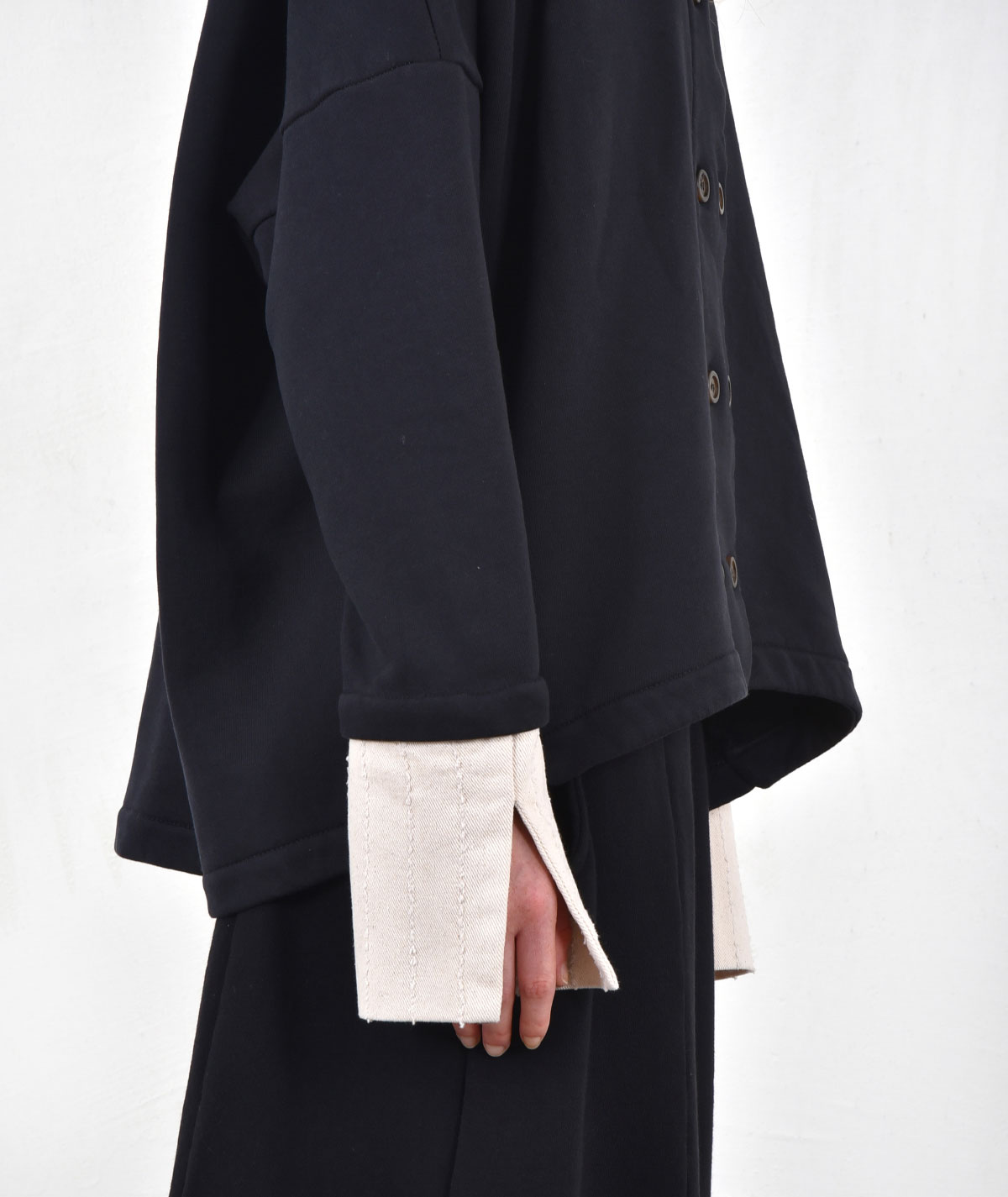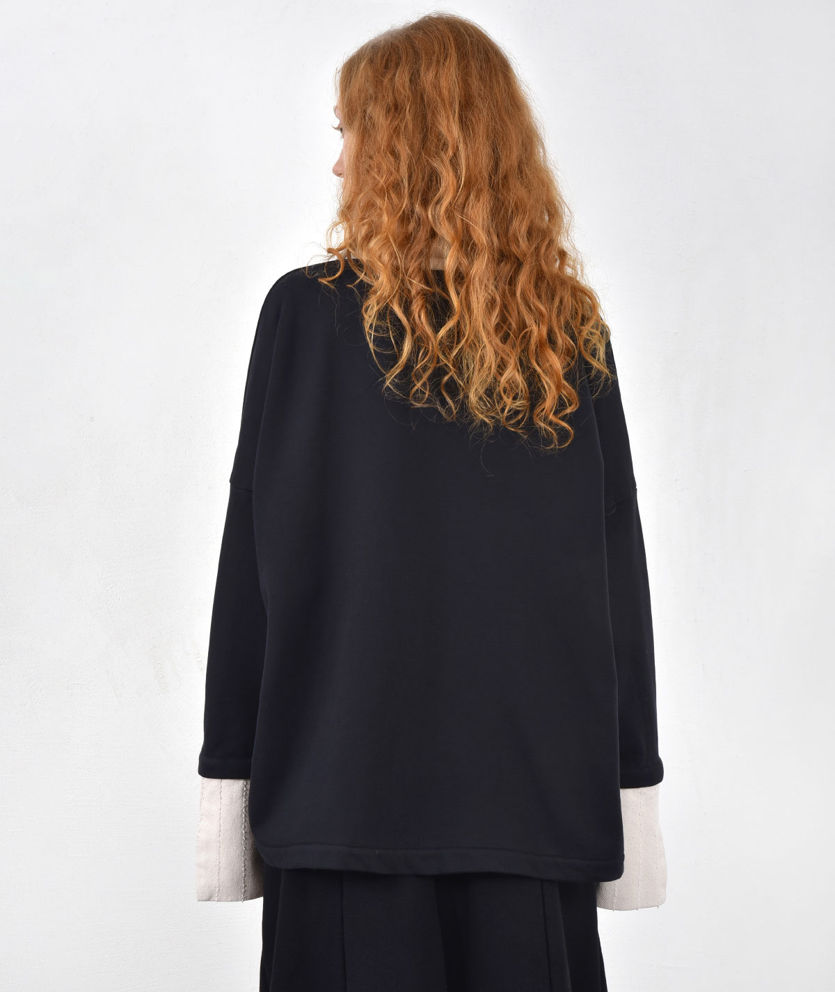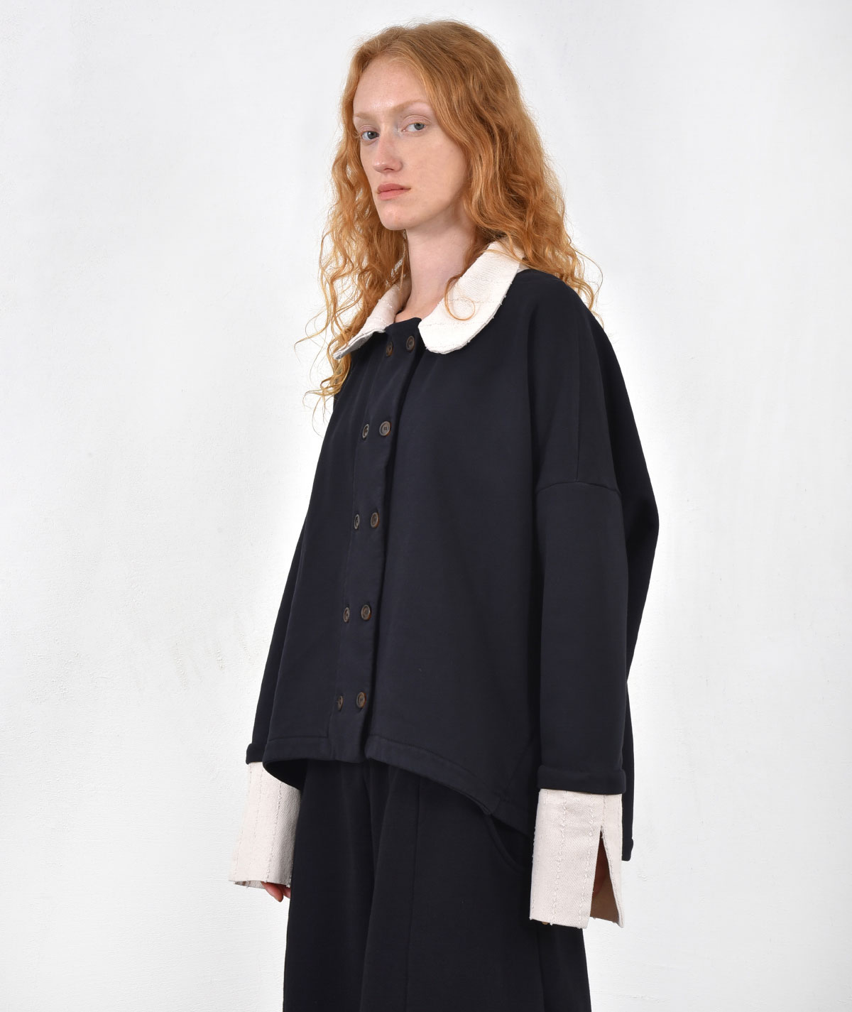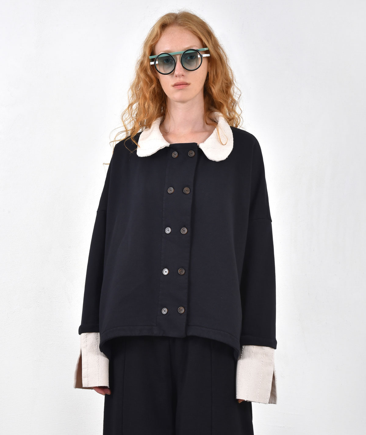A women’s sweatshirt-style jacket with a collar, made from structured cotton fabric and featuring front buttons. A chic design, perfect for office hours as well as your afternoon outings. Pair it with ecru trousers to create a flawless black-and-white look.