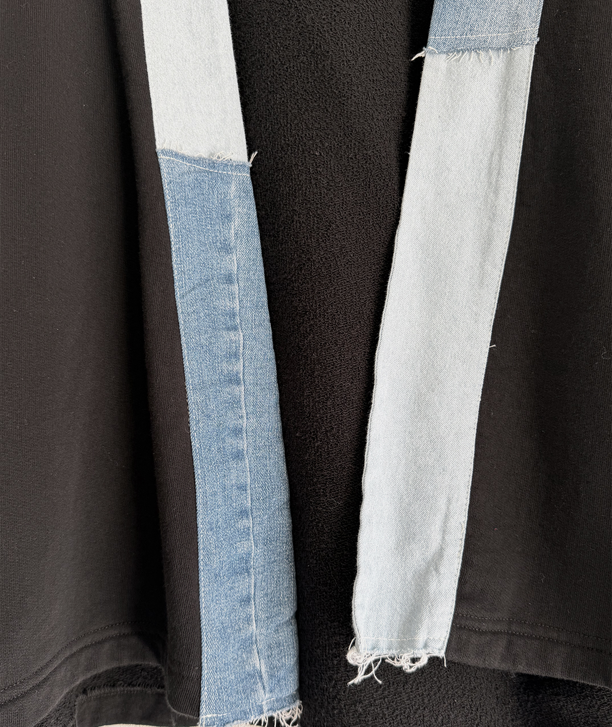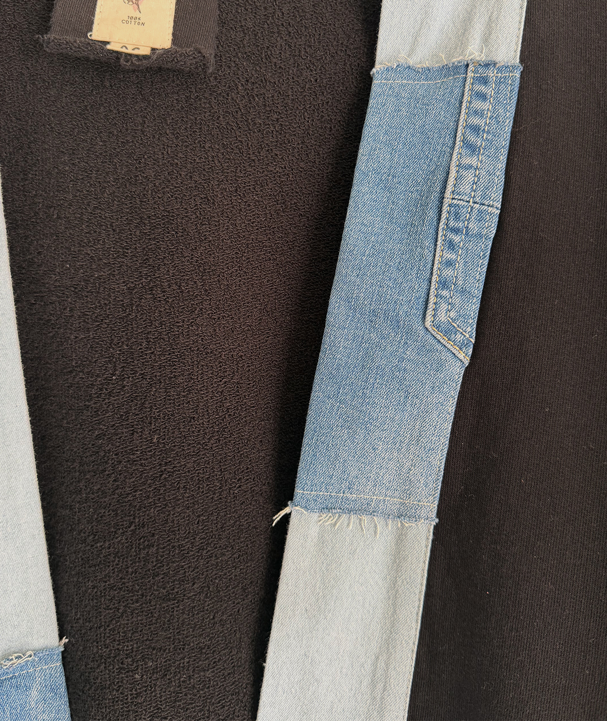 Kimono made from cotton sweatshirt fabric, featuring details from recycled old jeans. Each piece is created using different fabrics, making it truly one of a kind. A garment that gives denim a second life, without losing its timeless character.