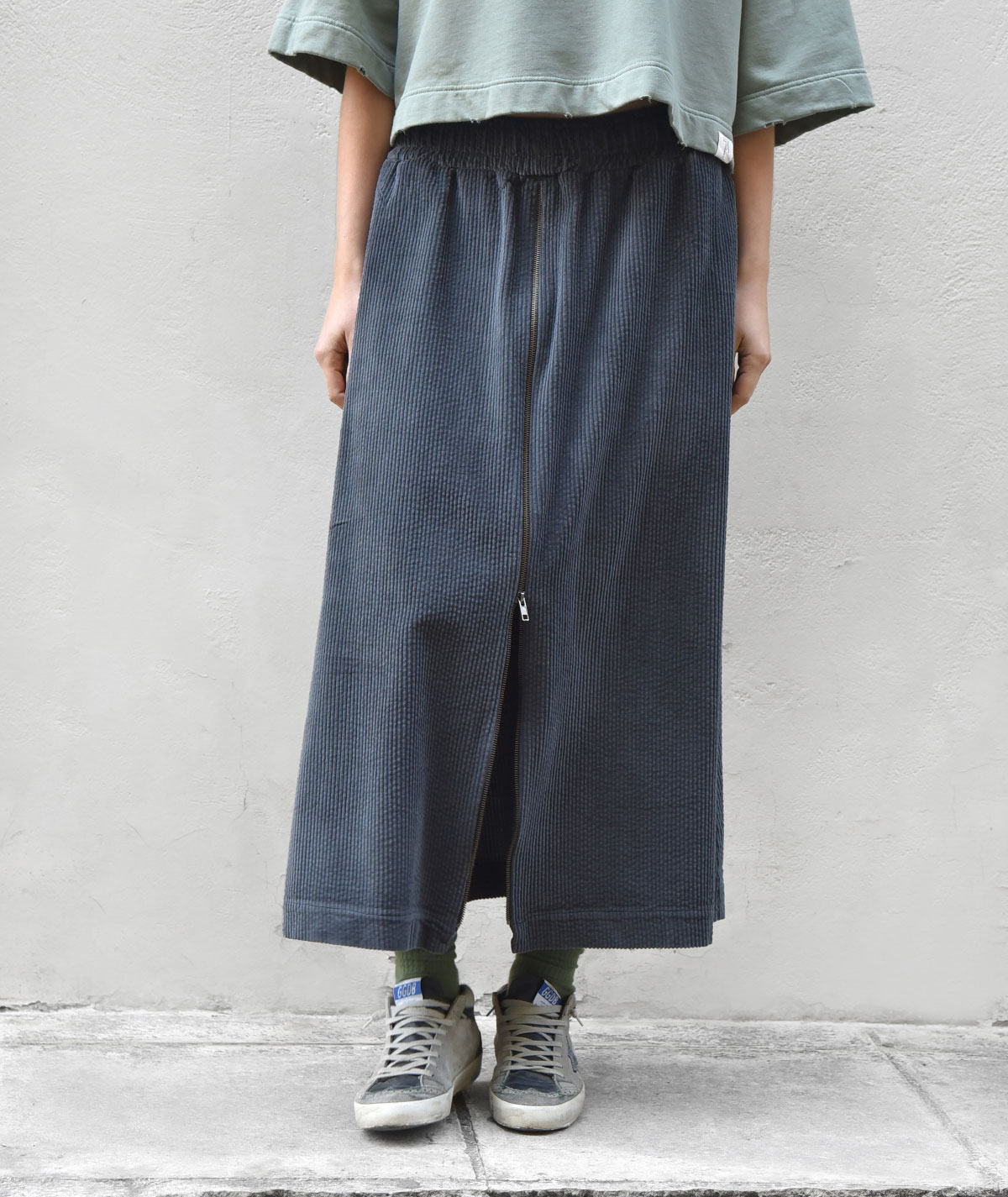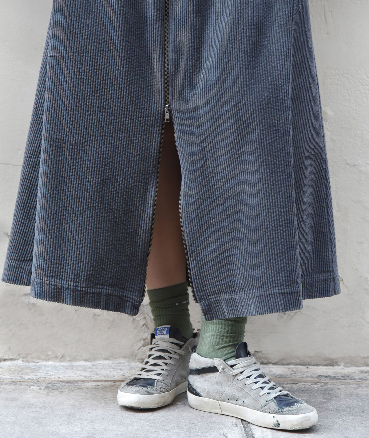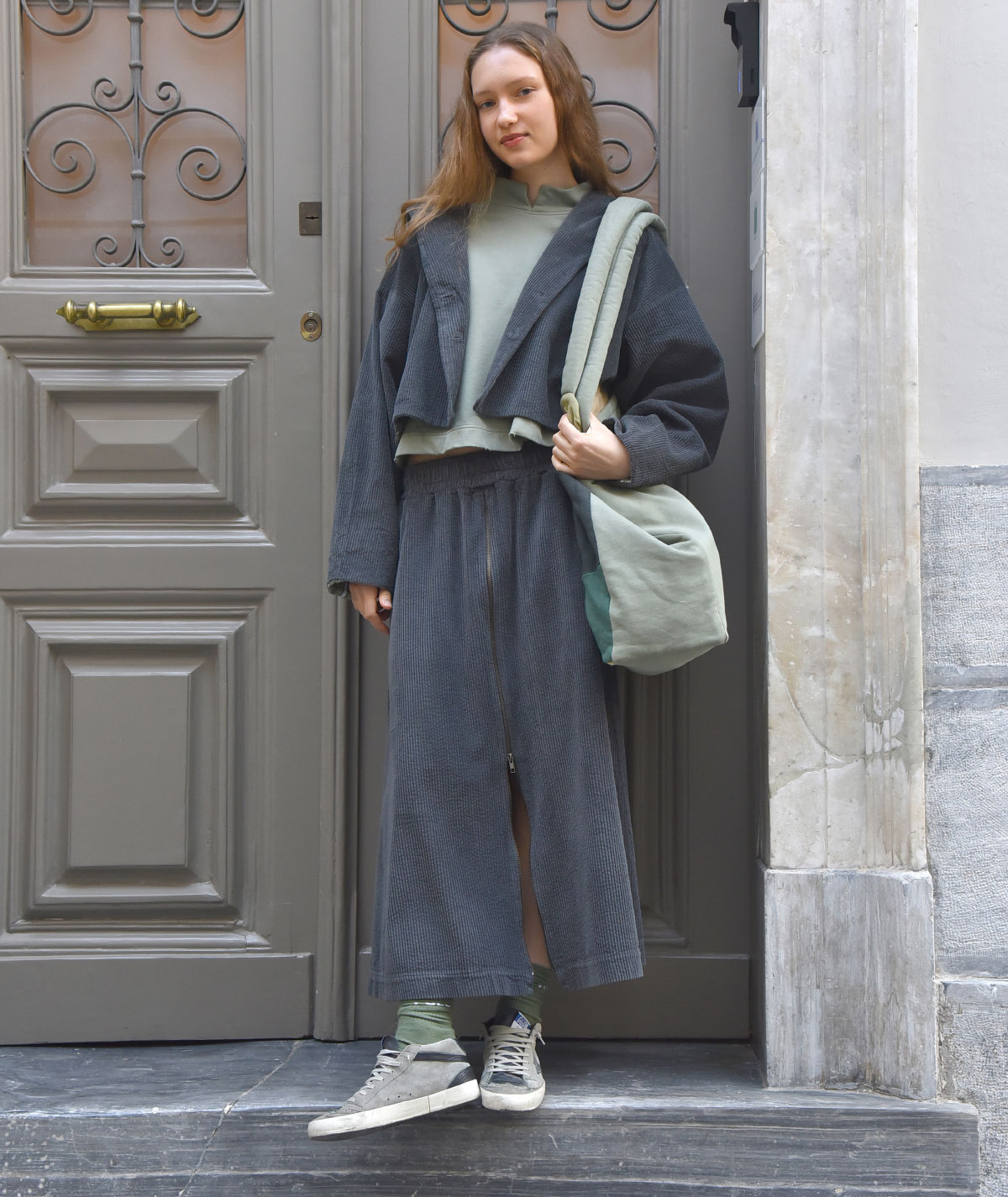 The long corduroy skirt from the collection stands out for its minimal design and comfortable fit. Featuring a center front zipper from waist to hem, it adds a modern touch while ensuring ease of wear. Pair it with the matching jackets from the collection for a complete, contemporary look.