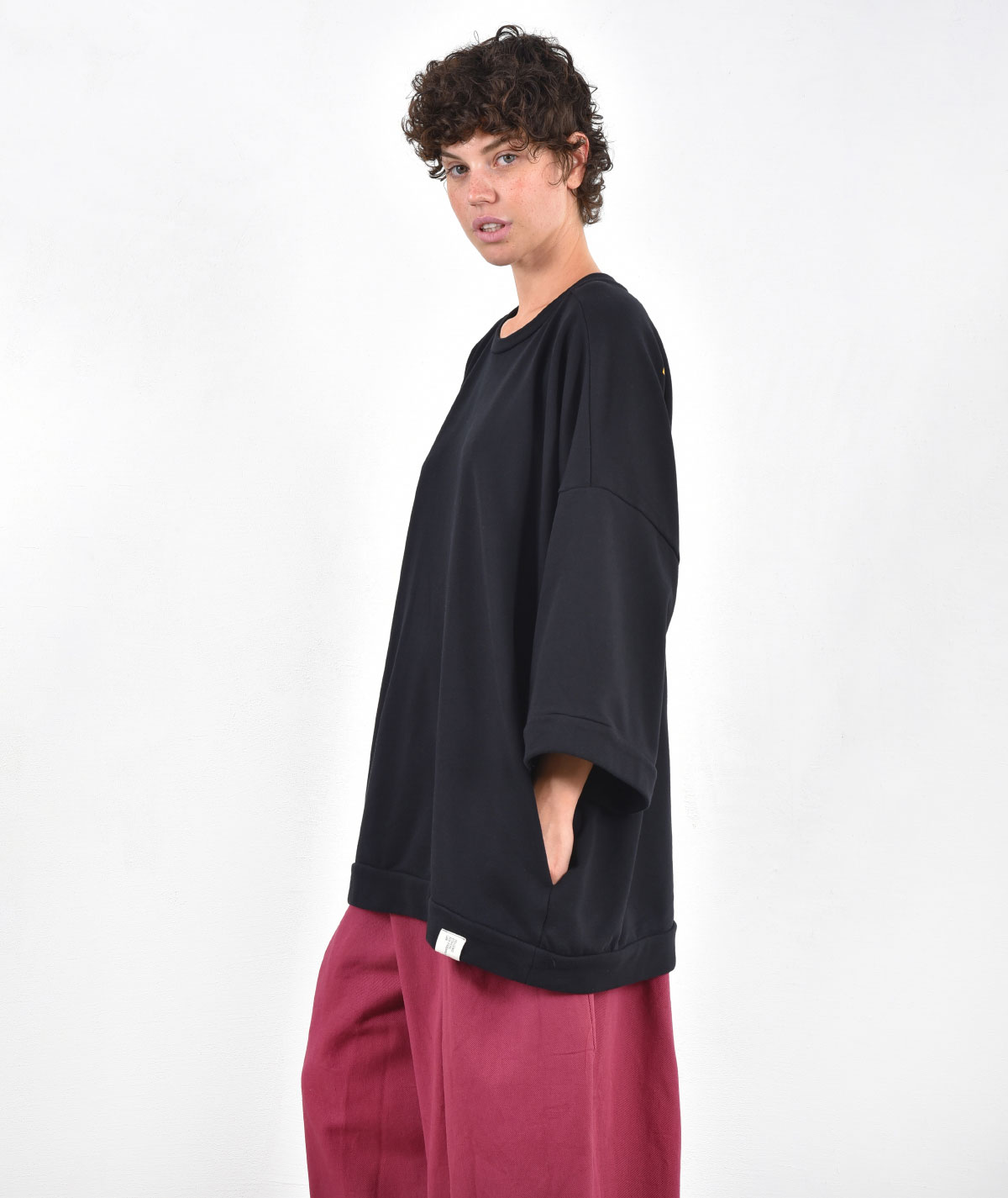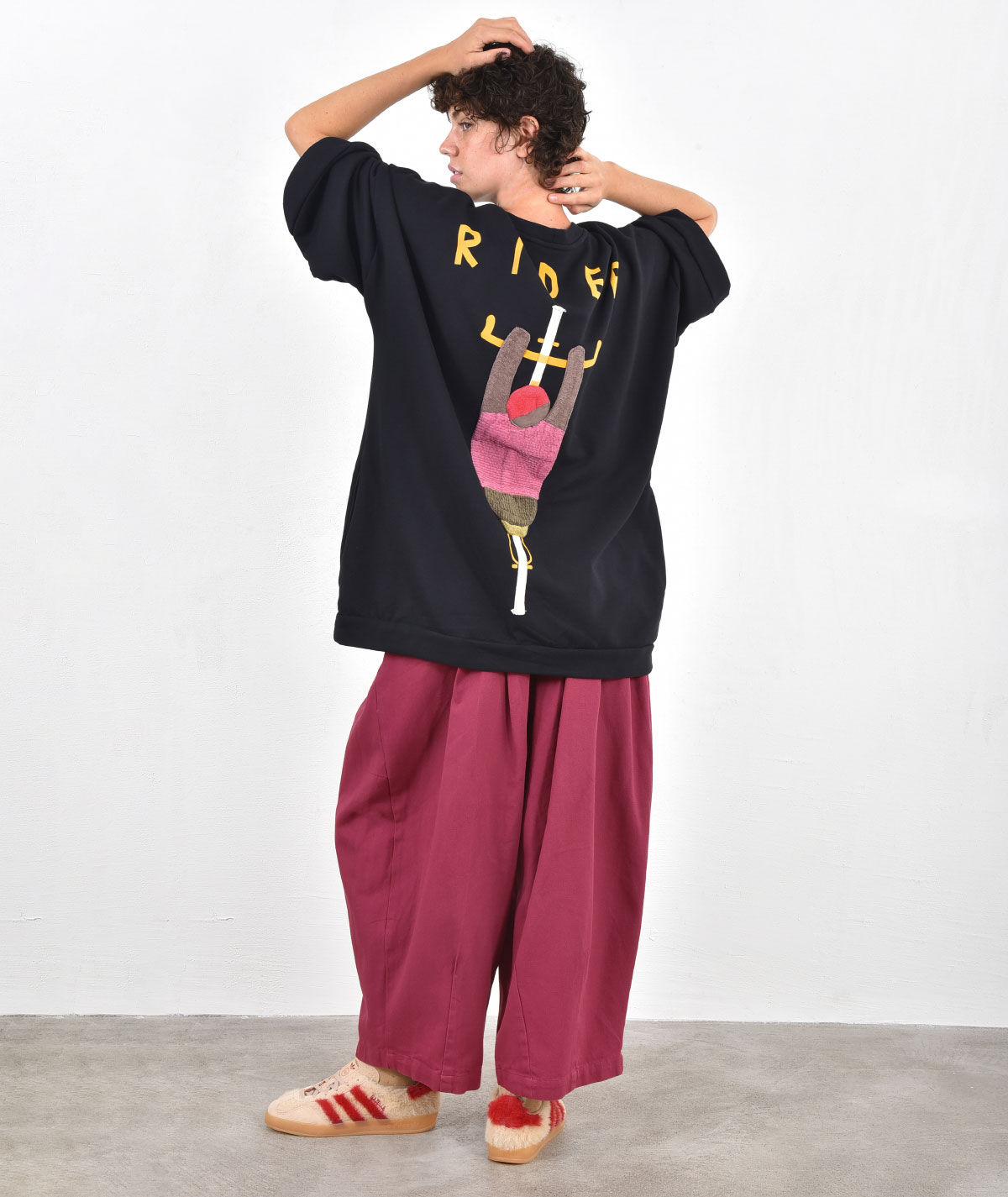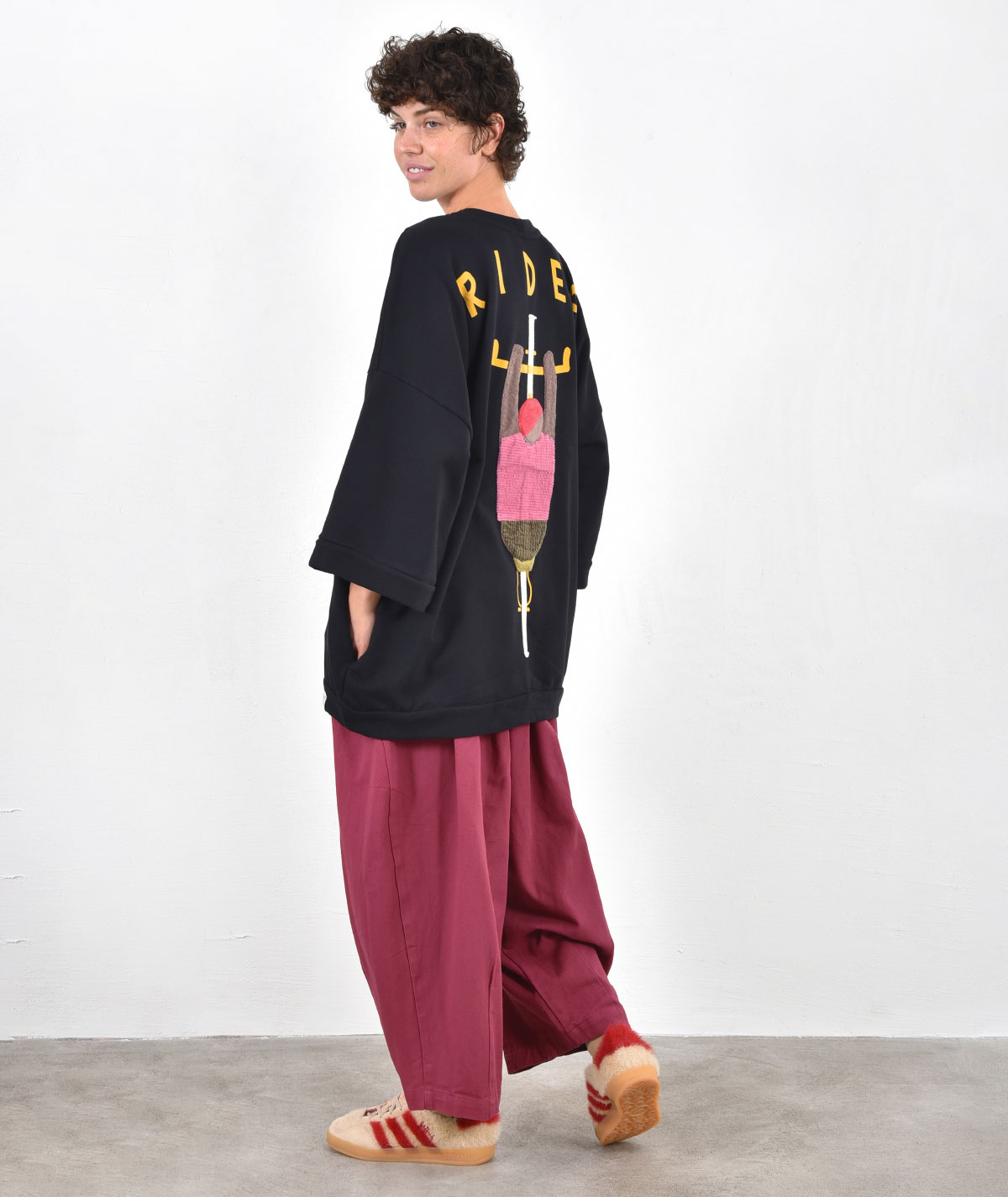 Oversized sweatshirt made of 100% cotton, featuring a handmade appliqué design of a cyclist, crafted from recycled fabrics we didn’t want to simply throw away. A distinctive piece that reflects a more responsible and creative approach to fashion. An eco-friendly choice that combines comfort, style, and respect for the environment. Perfect for everyday looks with character and consciousness.