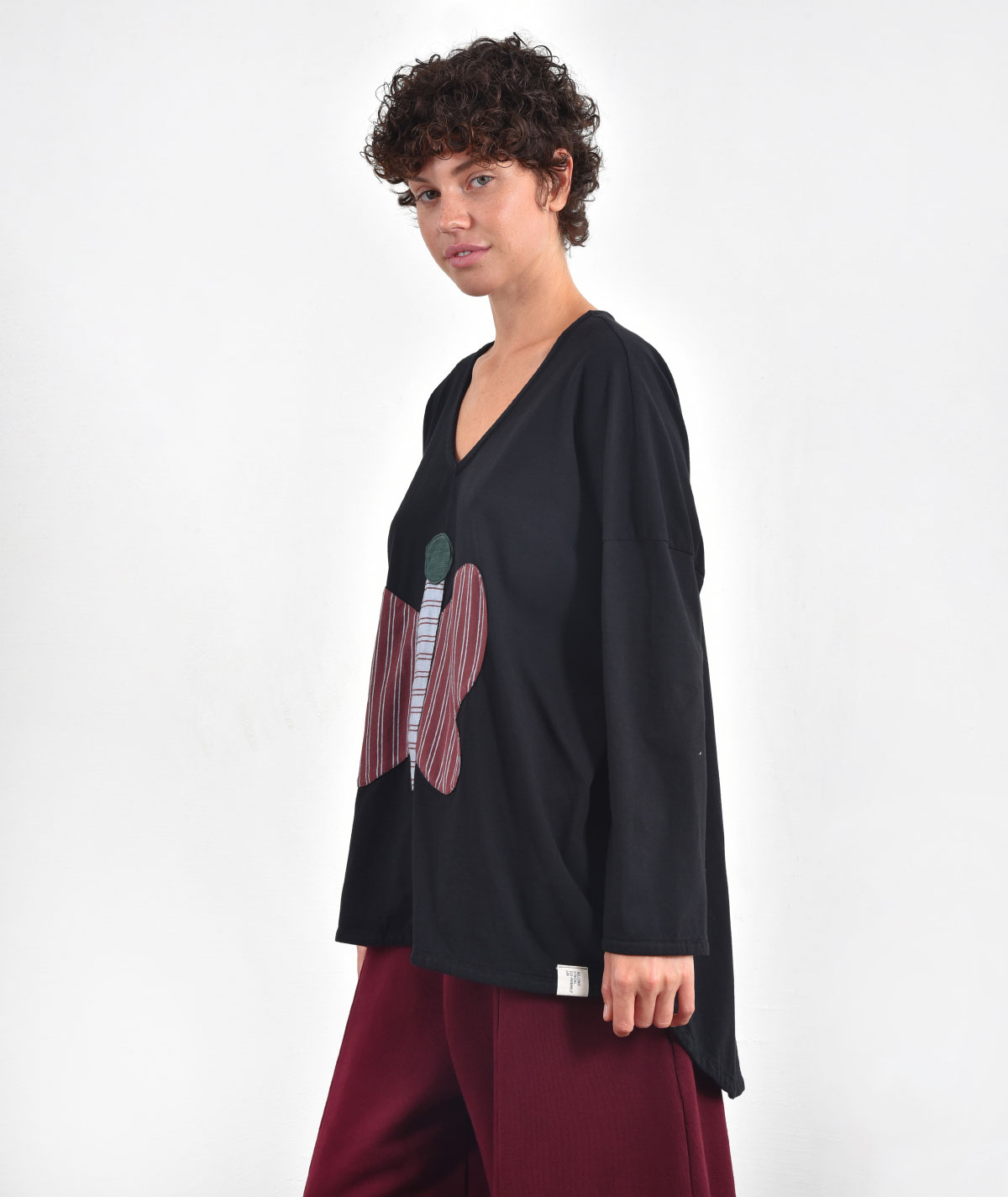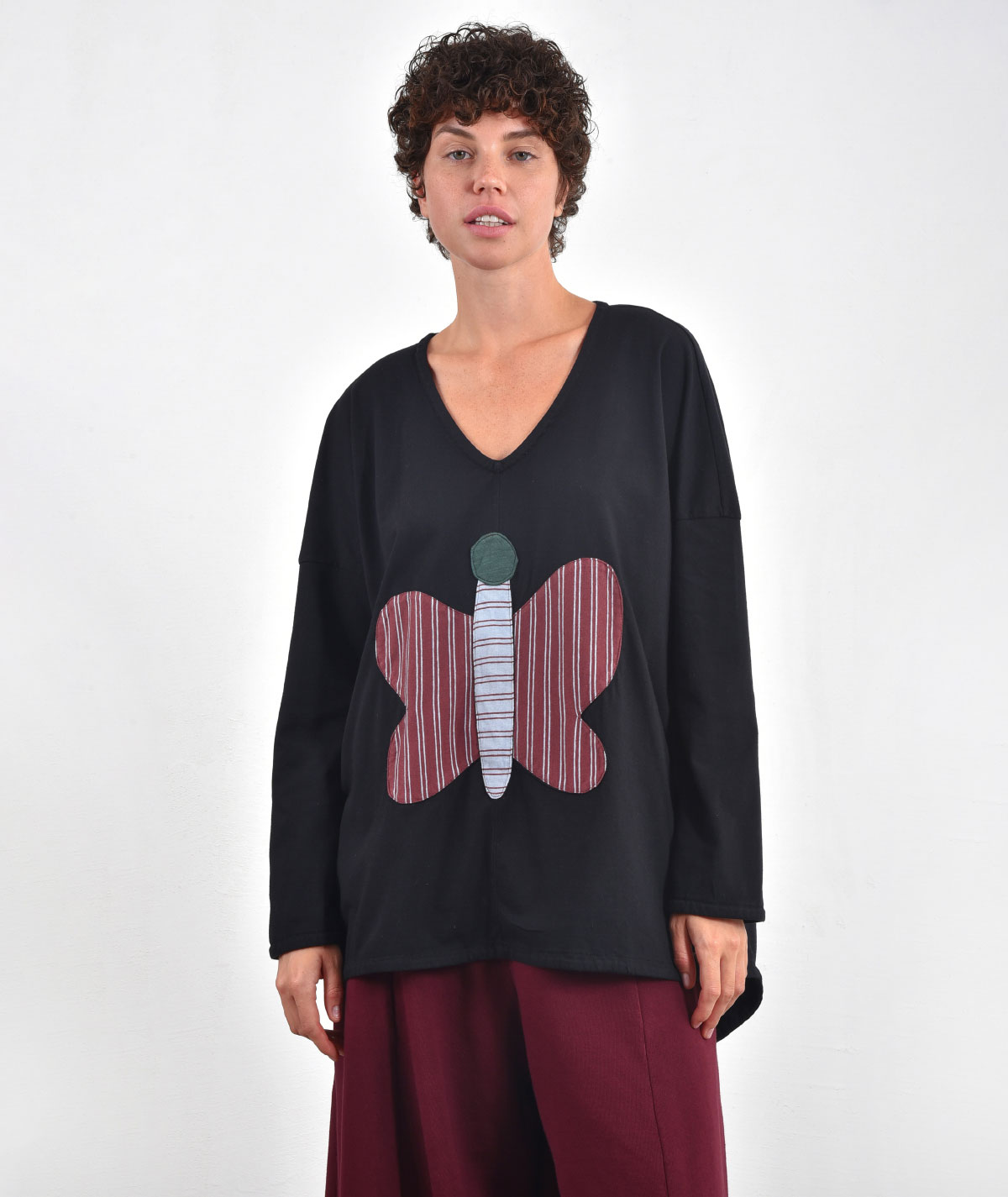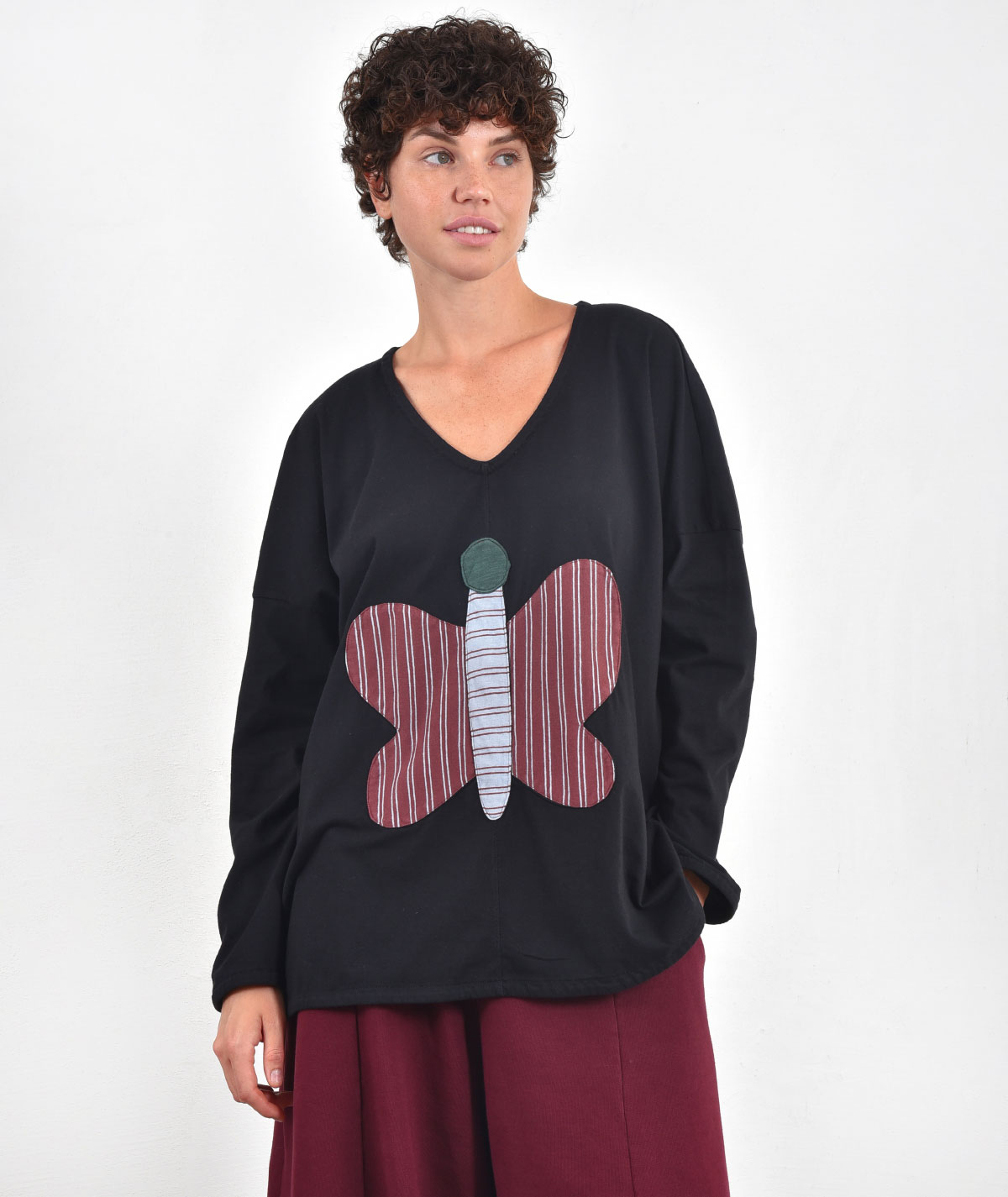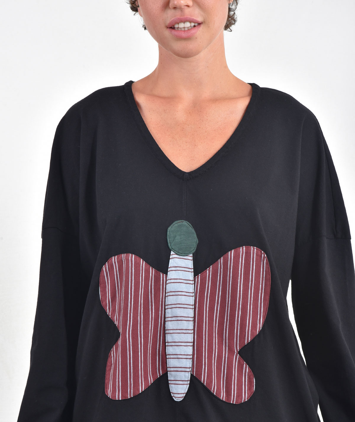 A women's asymmetrical blouse, with an open V-neck and a combination of fabrics on the front that create the image of a butterfly. A patchwork design, inspired by nature that gives personality to your style, making it unique. Combine it perfectly with the pants of the collection.