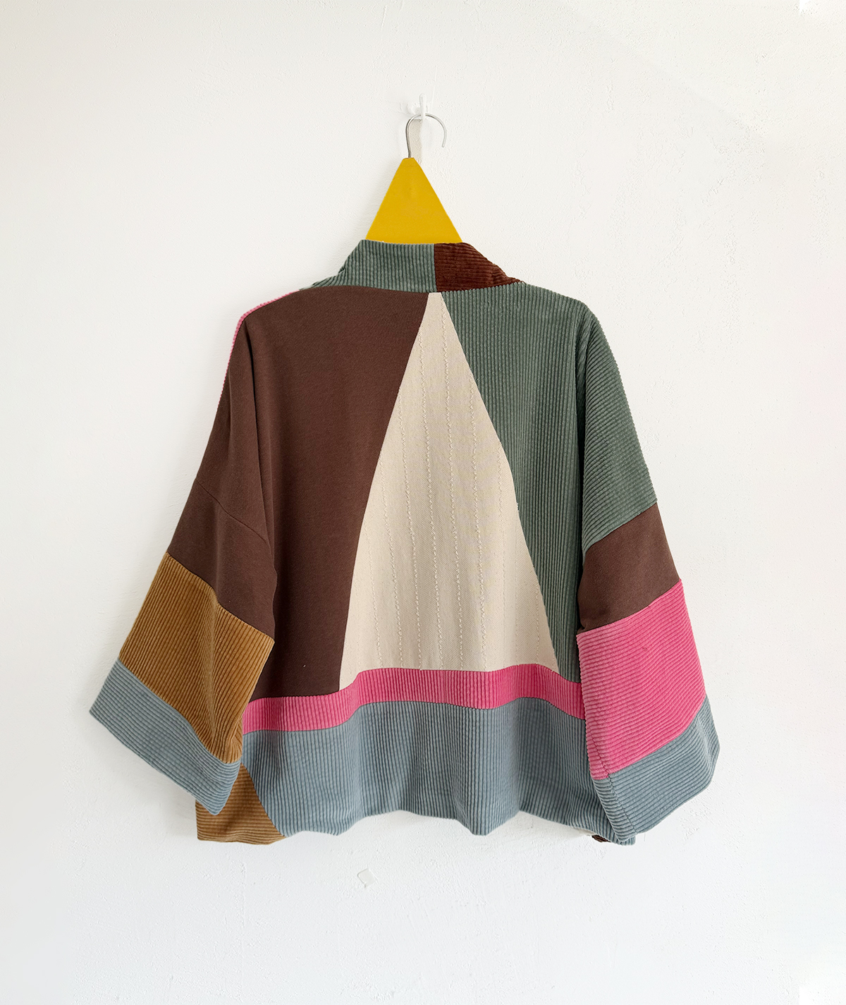 A kimono jacket made from leftover fabrics from previous productions. Each piece is assembled intuitively yet thoughtfully — nothing identical, nothing random. Its relaxed fit makes it easy to wear throughout the day, layered over everyday garments. One size, produced in only 8 pieces.