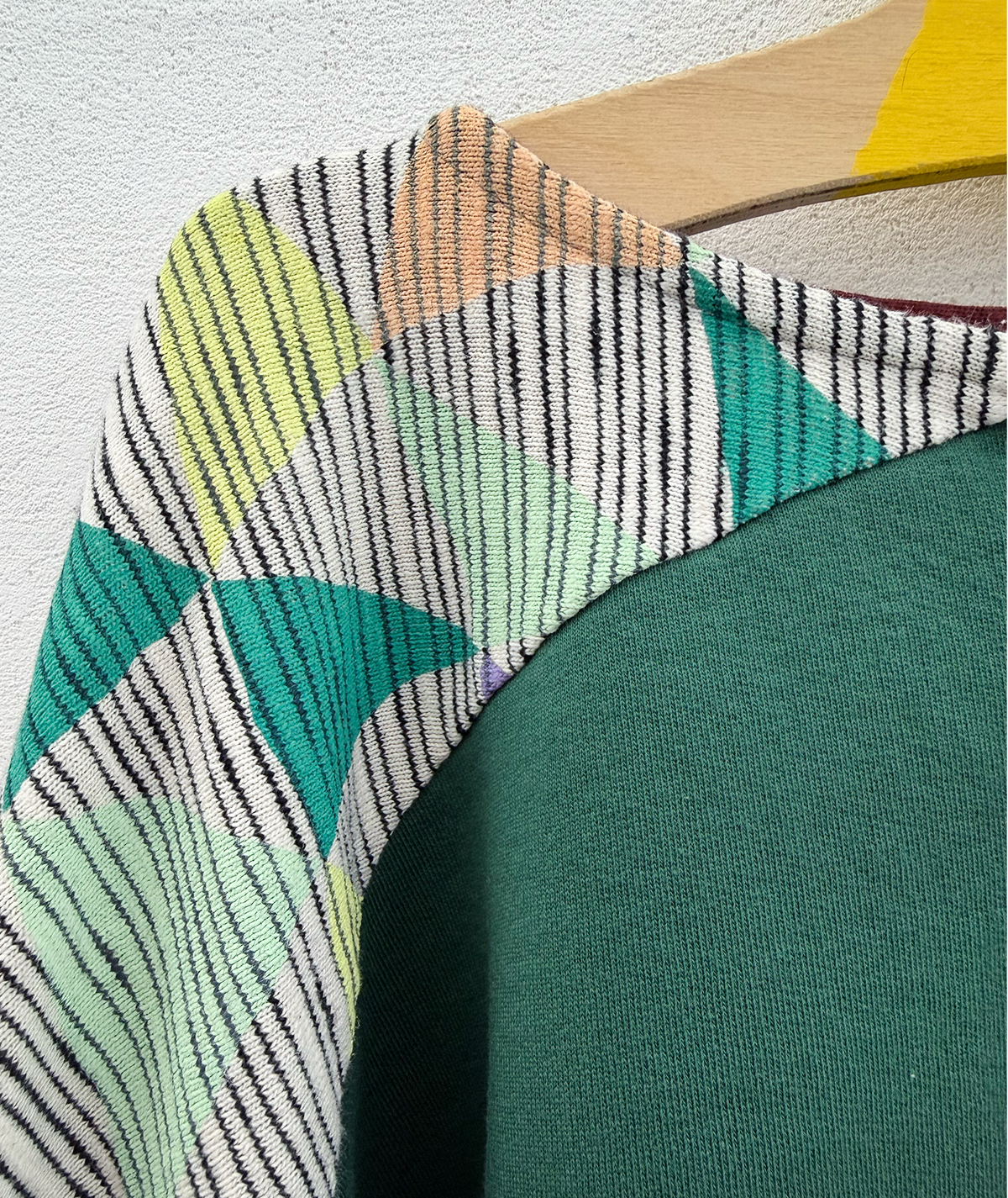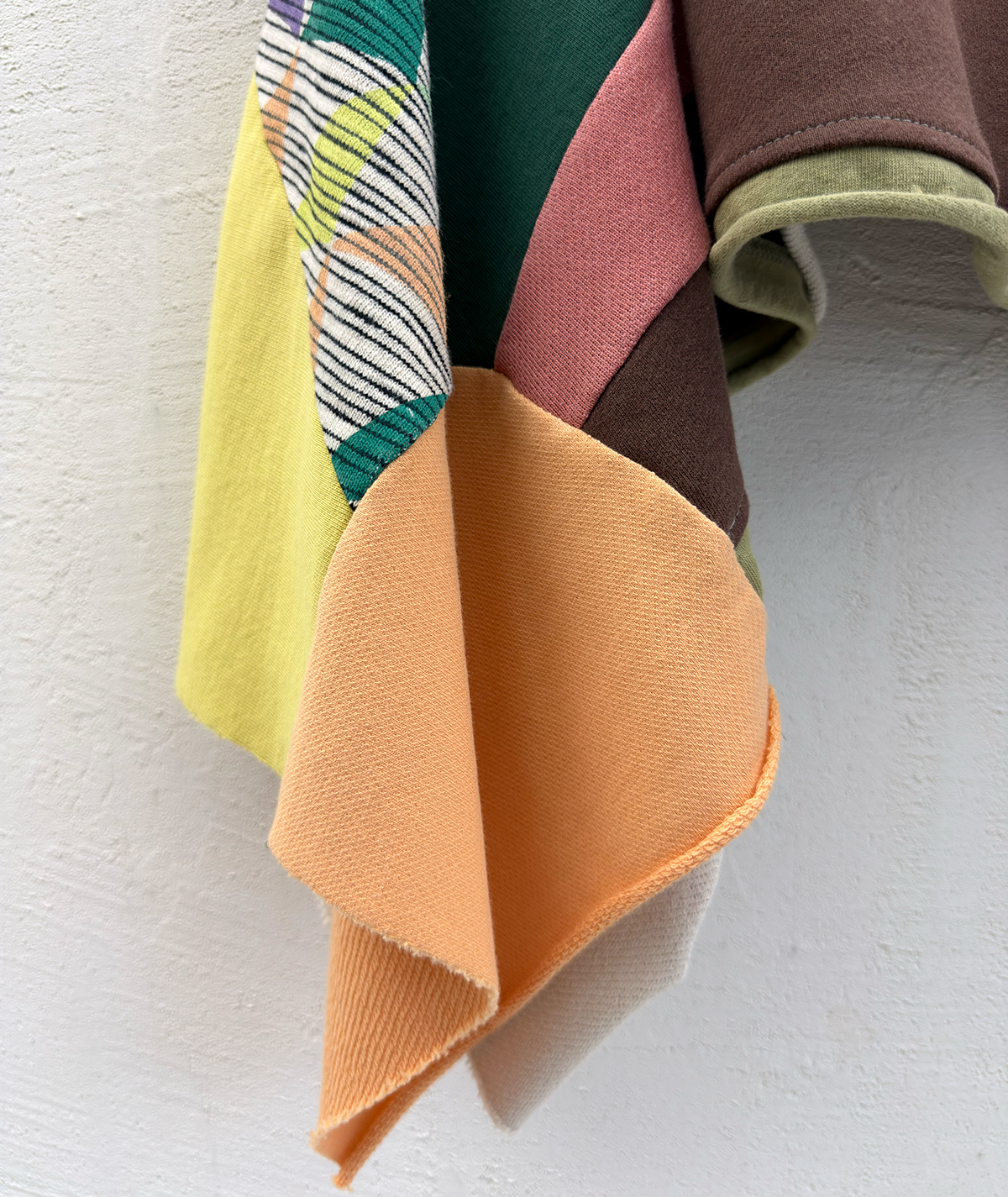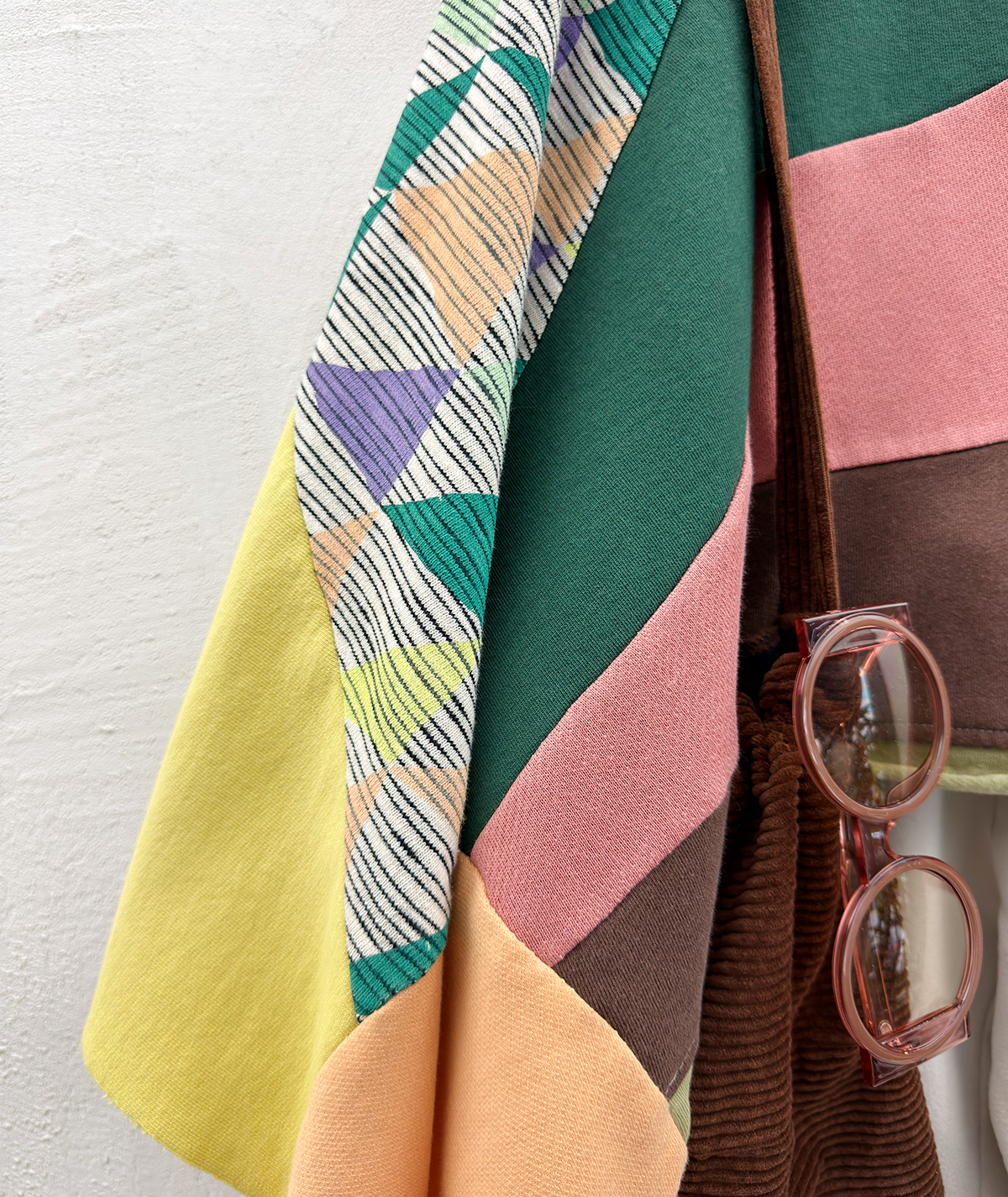 A women's handmade poncho made of 100% cotton with sunset patterns combined with prints and pieces of colored fabrics. A polymorphic design that can also be worn as a bolero with a simple movement and give a unique style to your look. Combine it perfectly over dresses or with the pants of the collection. Our patchwork pieces are handmade and one of a kind. Due to their unique character and construction, slight variations from the photo may occur.
