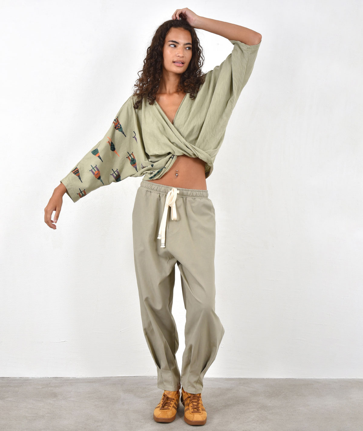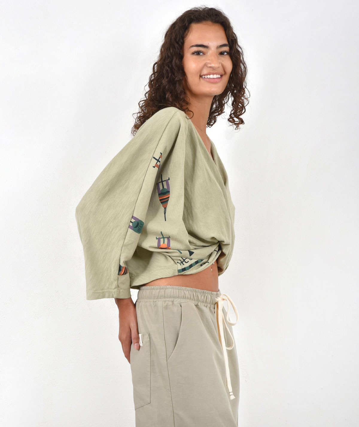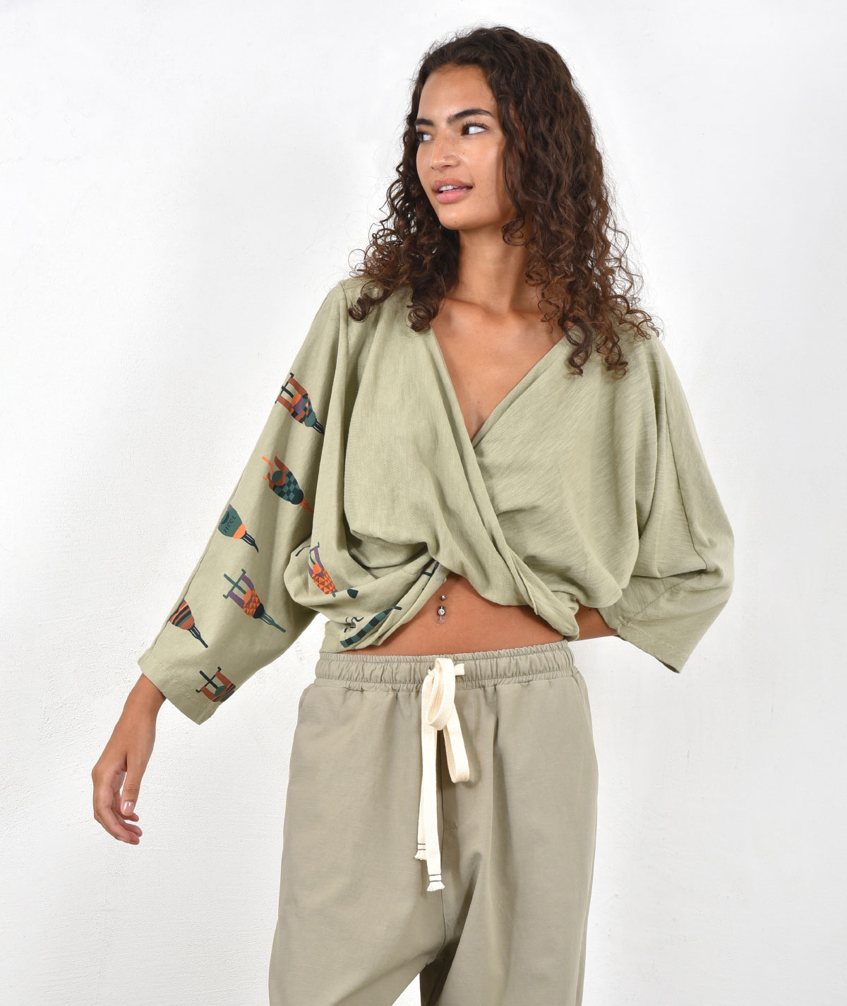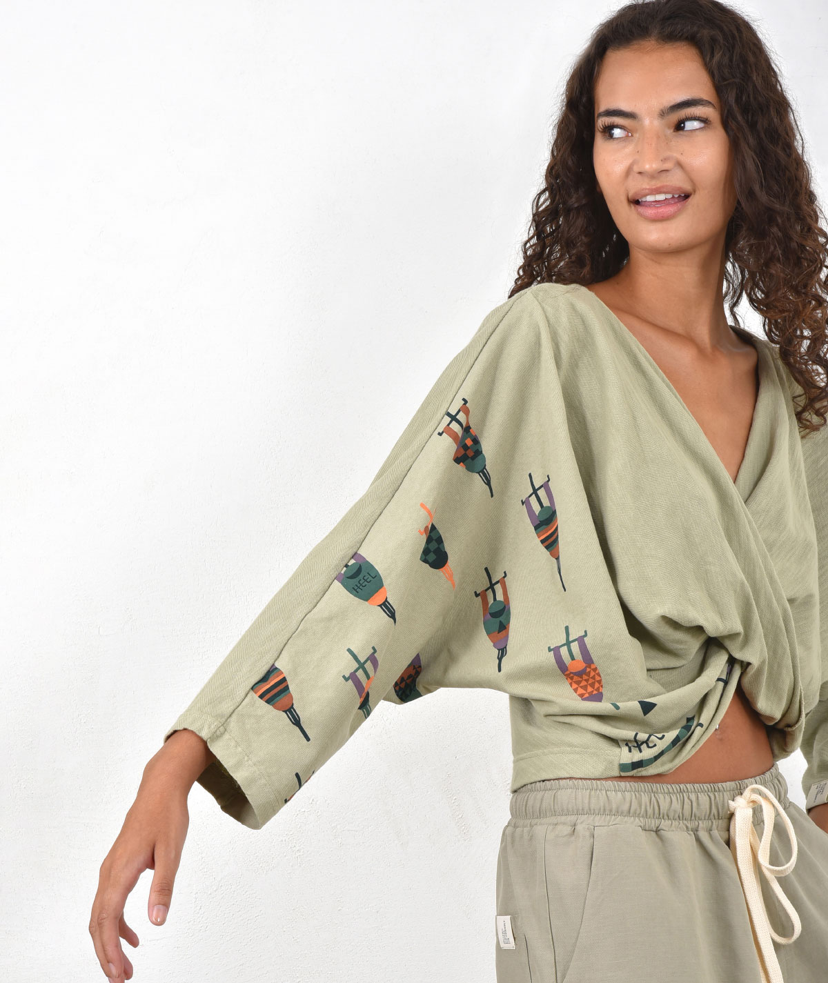 Women's polymorphic twisted blouse with prints made of 100% cotton.