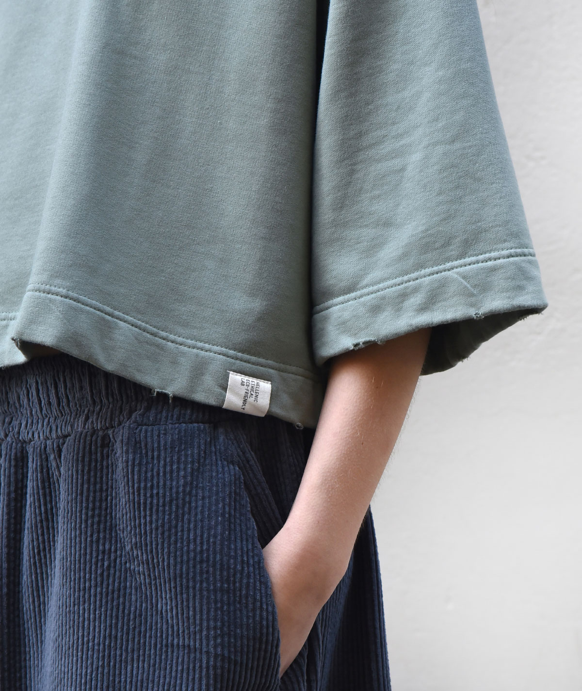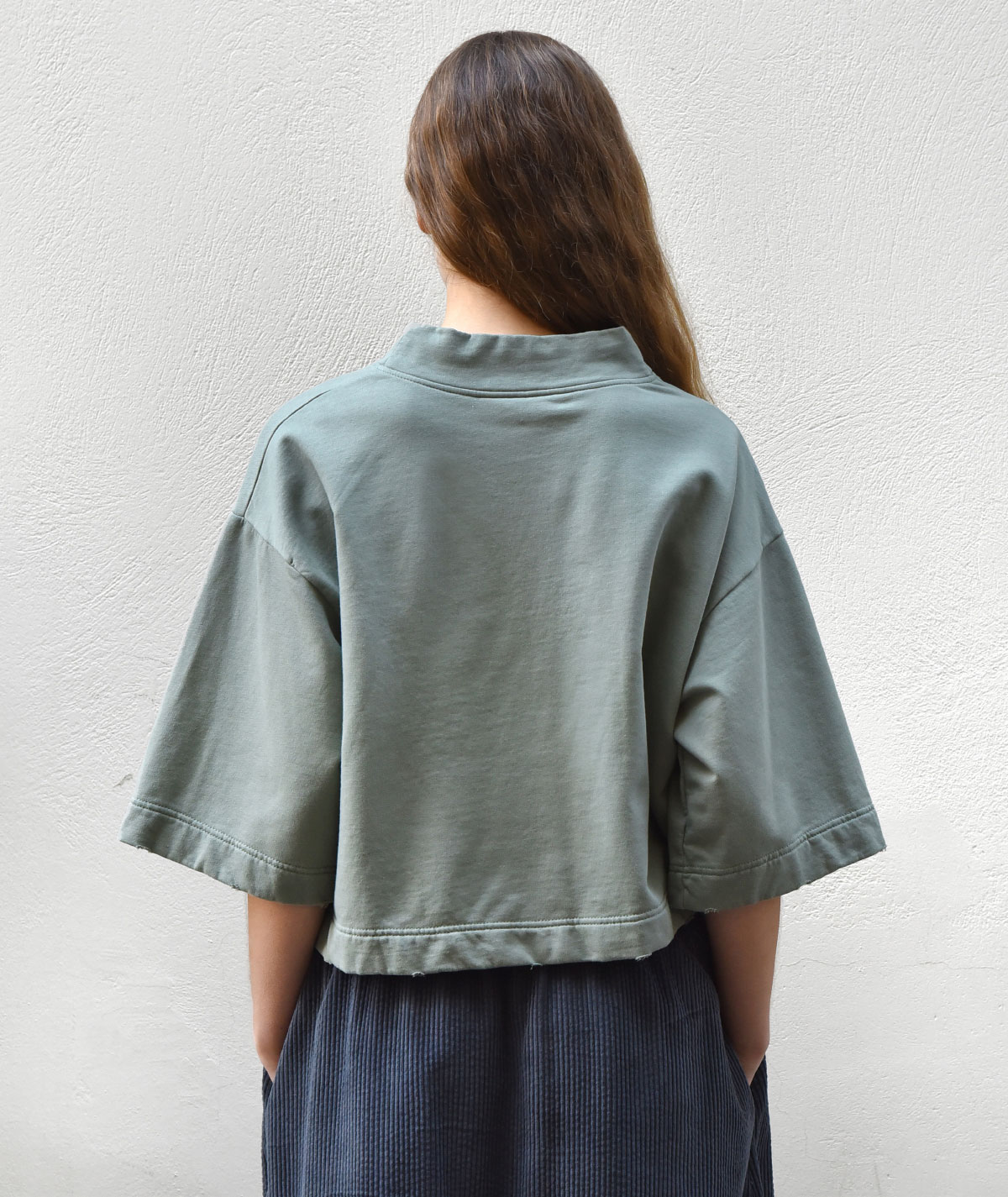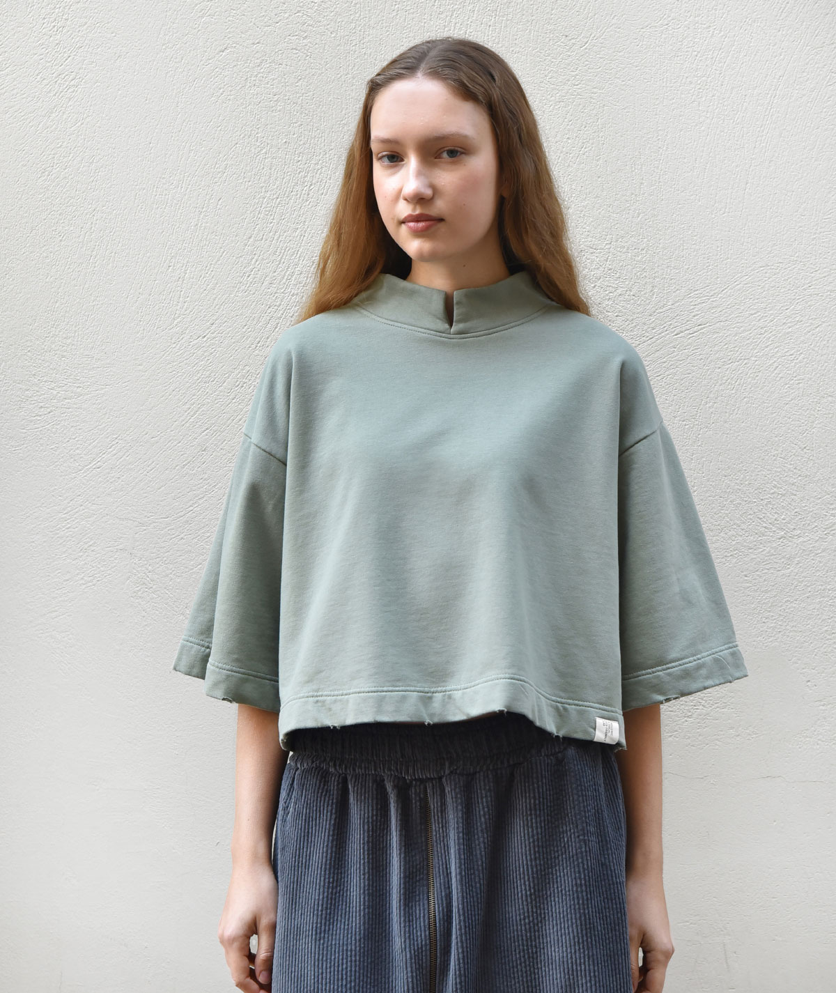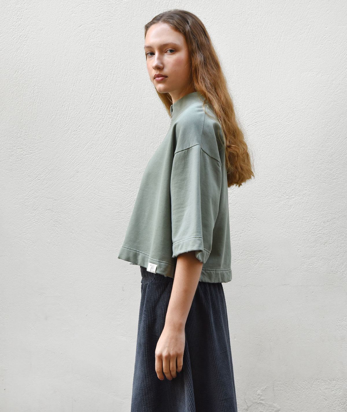 A comfortable crop top featuring a Mao-style turtleneck and relaxed fit. Designed with 3/4 bell sleeves for a stylish, modern look. Made from 100% cotton for a soft feel and all-day comfort. Perfect for casual outfits that combine ease and elegance.