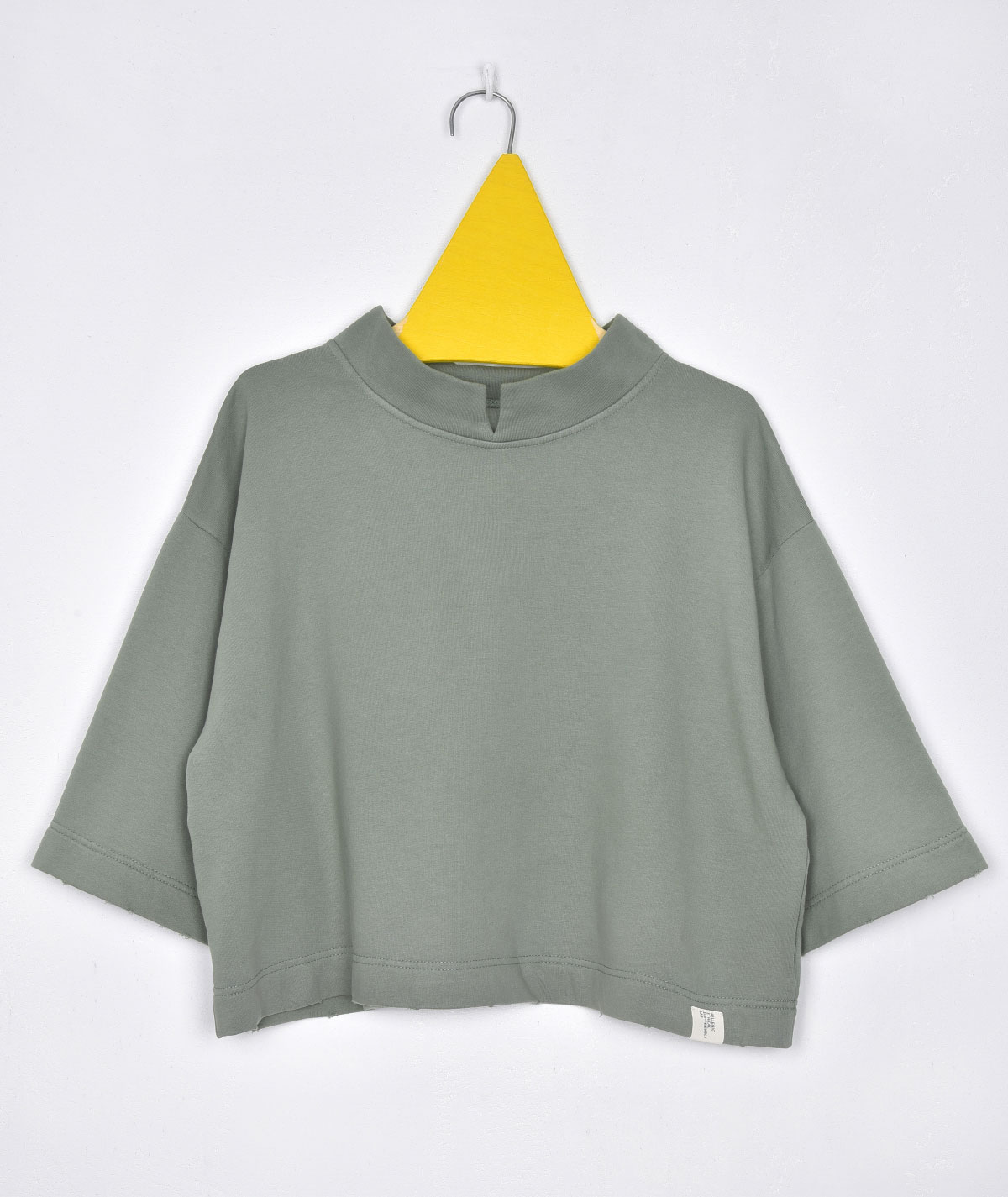 A comfortable crop top featuring a Mao-style turtleneck and relaxed fit. Designed with 3/4 bell sleeves for a stylish, modern look. Made from 100% cotton for a soft feel and all-day comfort. Perfect for casual outfits that combine ease and elegance.