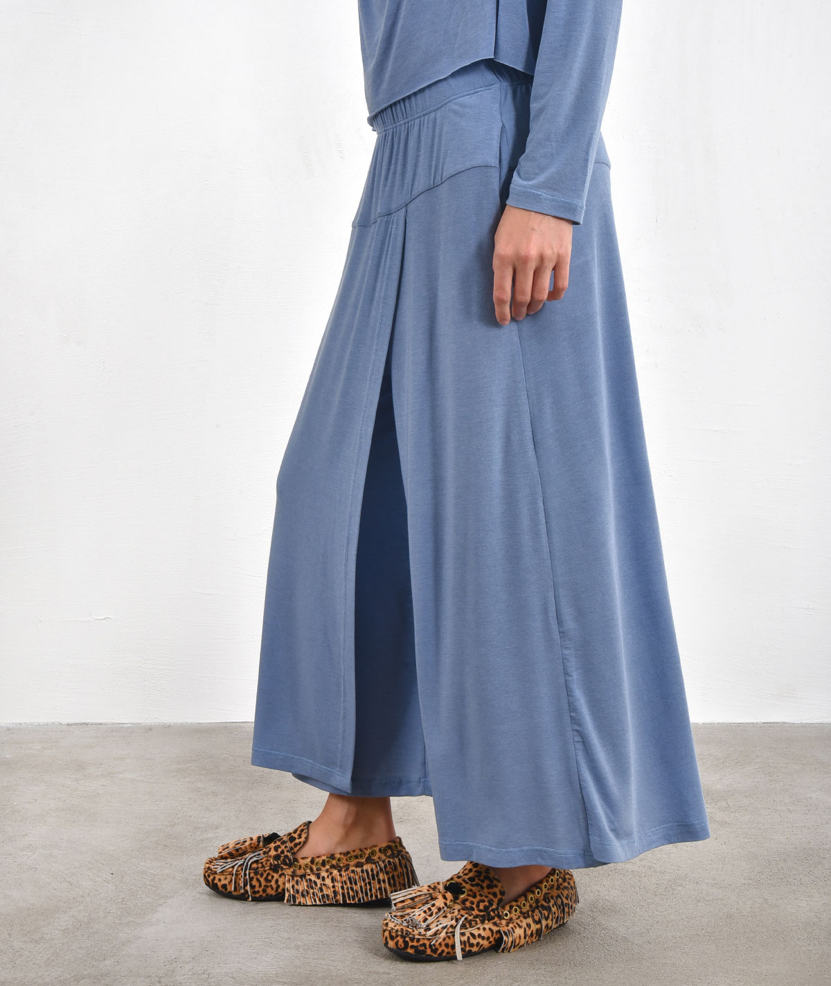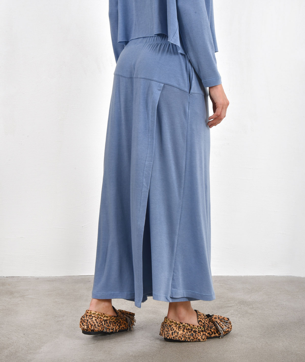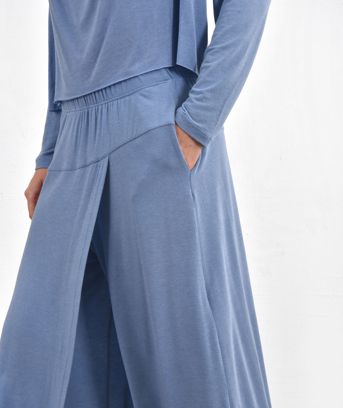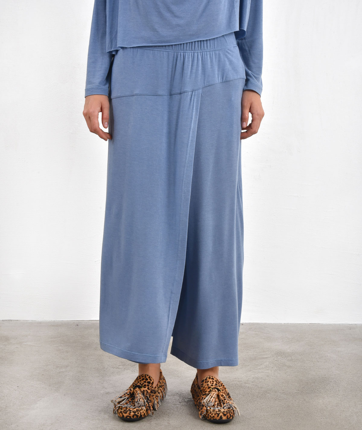 Skirt-Pants with elastic waistband made of 73% Tencel, 19% wool, and 5% elastane.