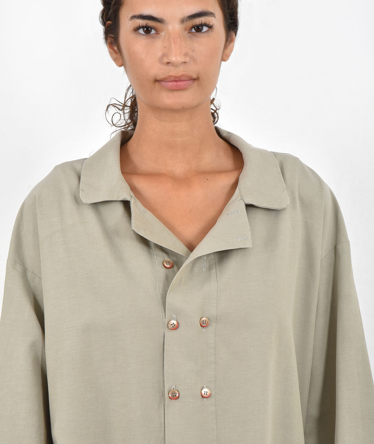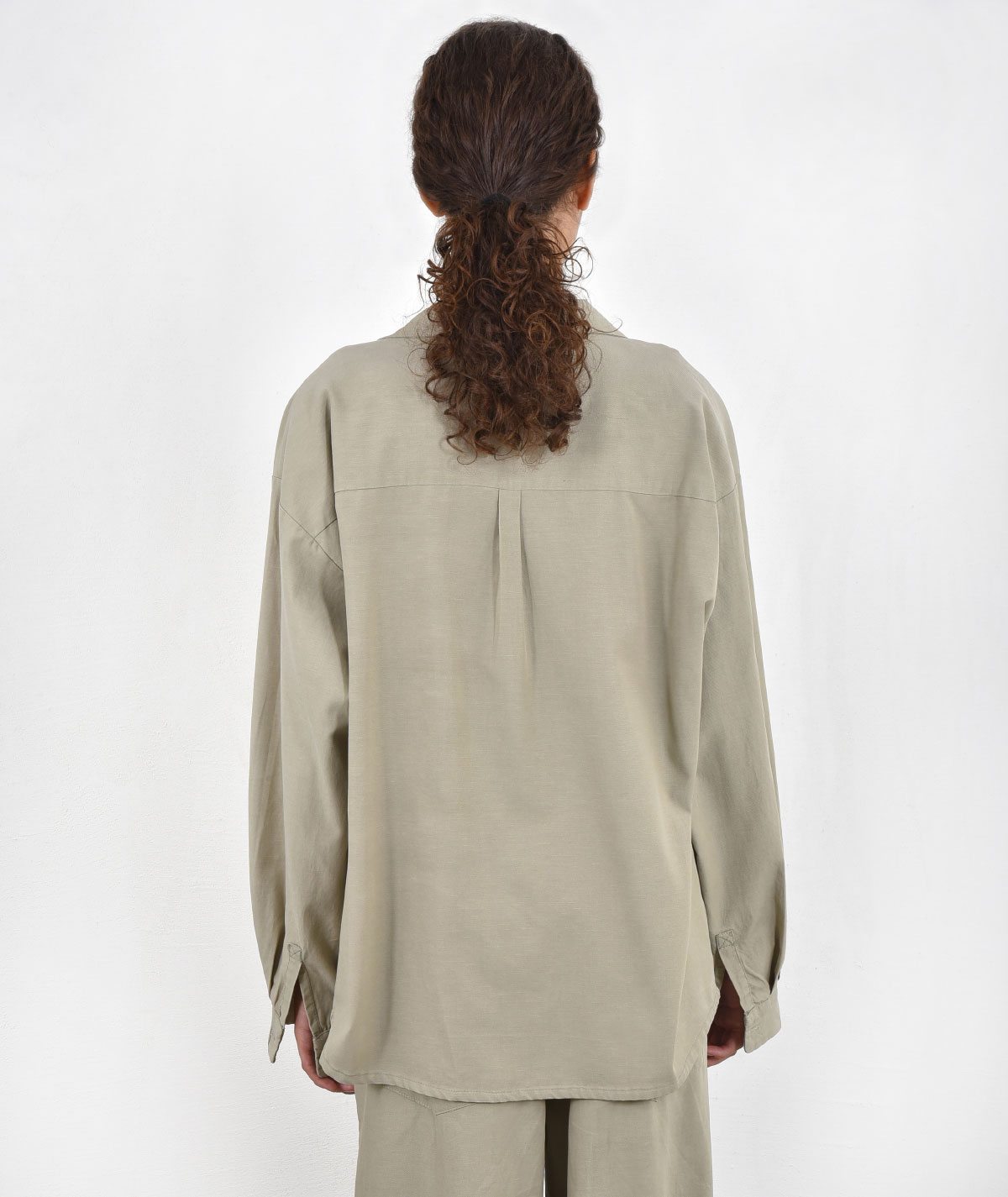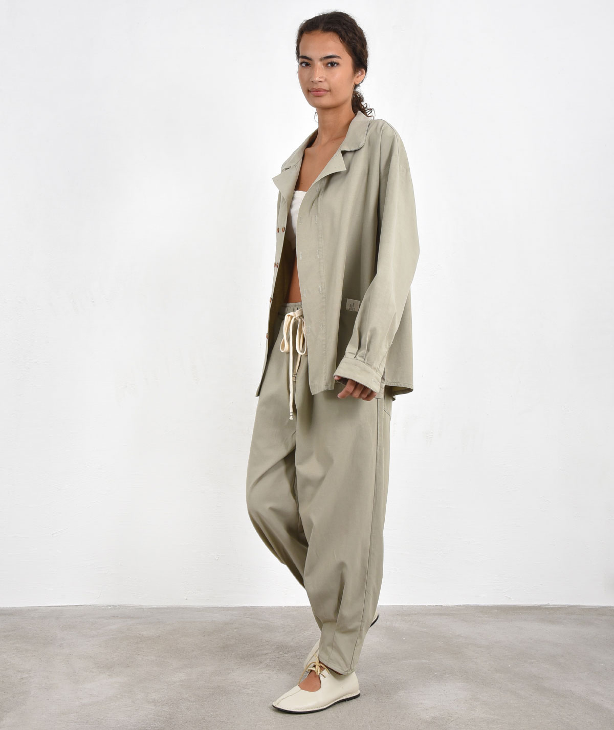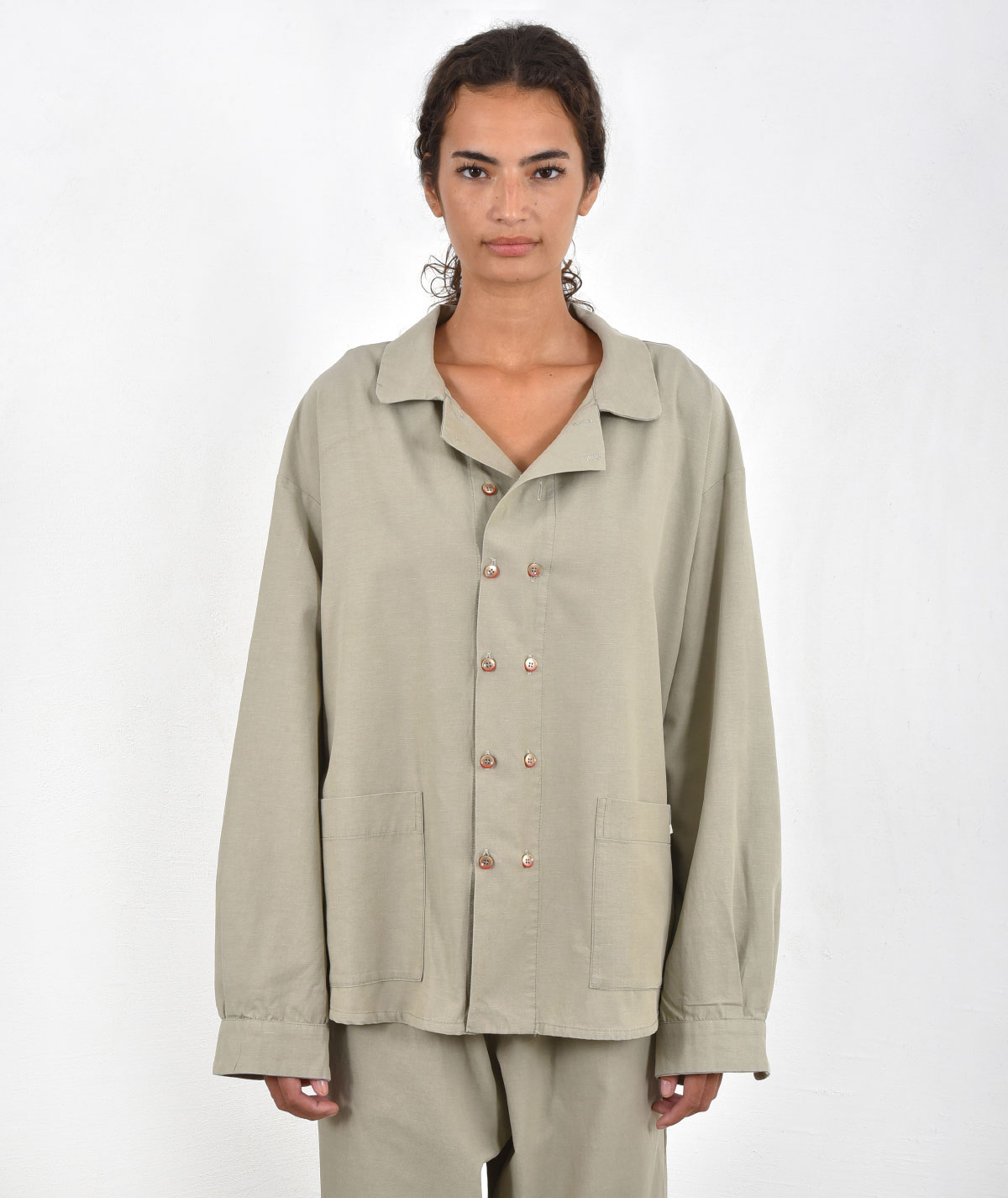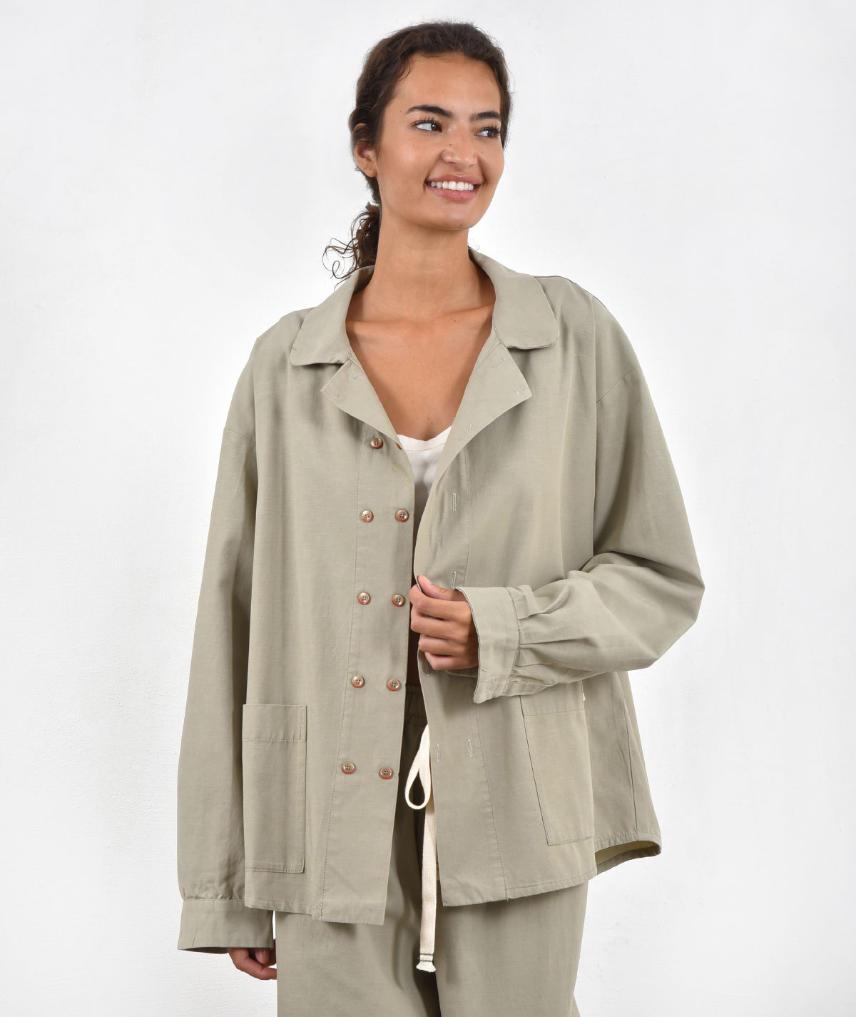 Unisex cargo Jacket with pockets and buttons on the front made of 54% lyocell and 46% cotton.