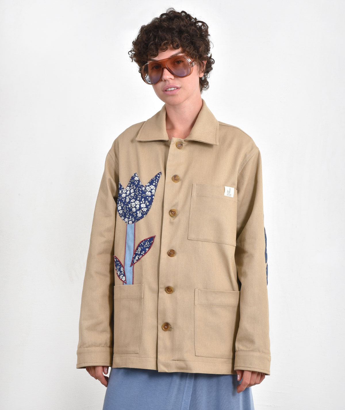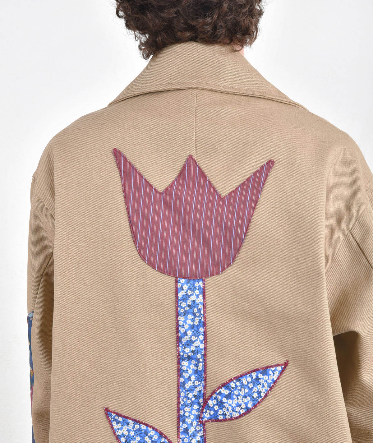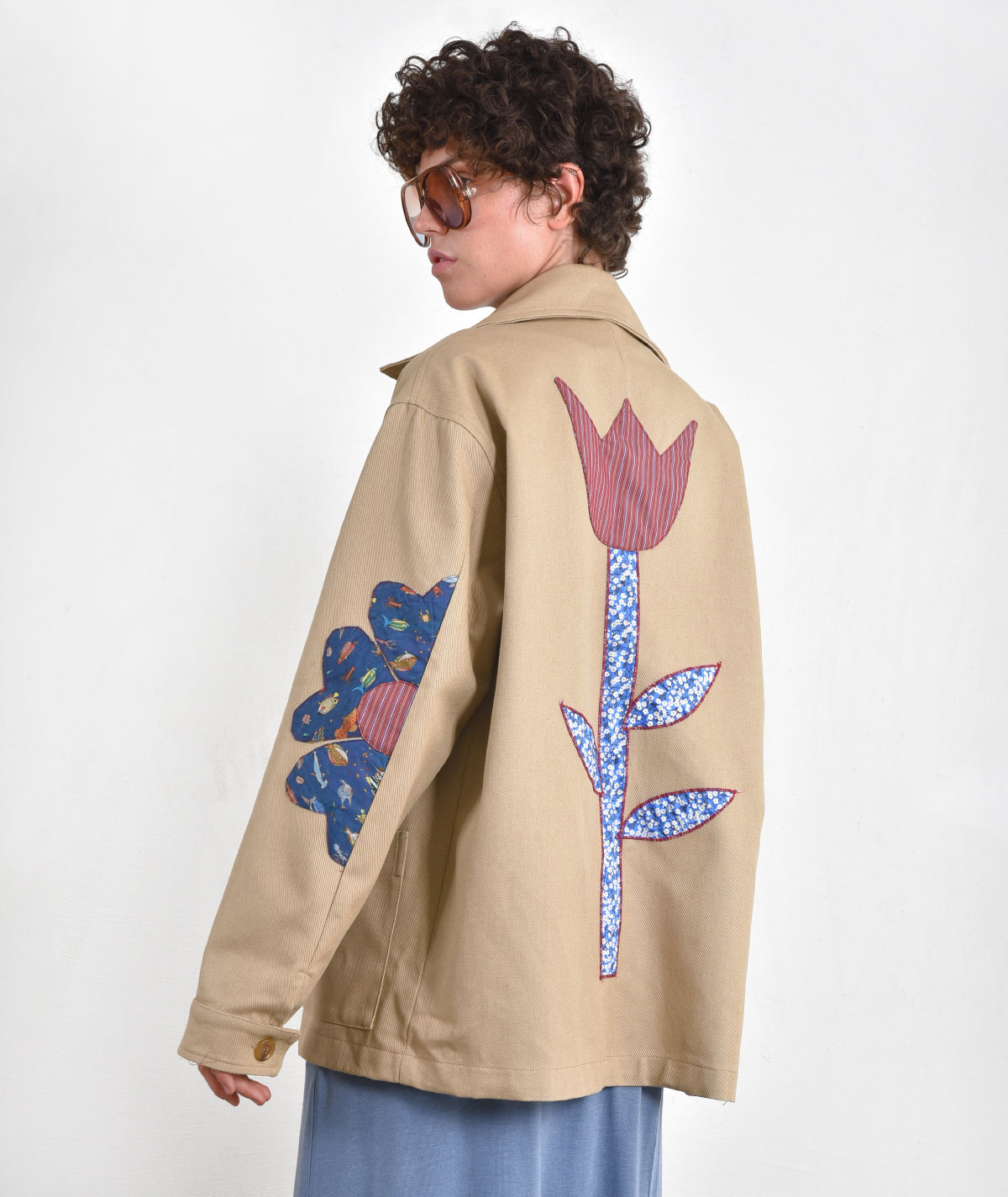 Unisex jacket crafted from premium cotton canvas, adorned with bold appliqué flowers, each hand-cut and hand-placed using leftover fabric remnants. Designed and handmade in our studio in limited quantities, it offers style, comfort, and a true statement aesthetic. A standout piece that elevates any outfit—from casual looks to more refined ensembles.