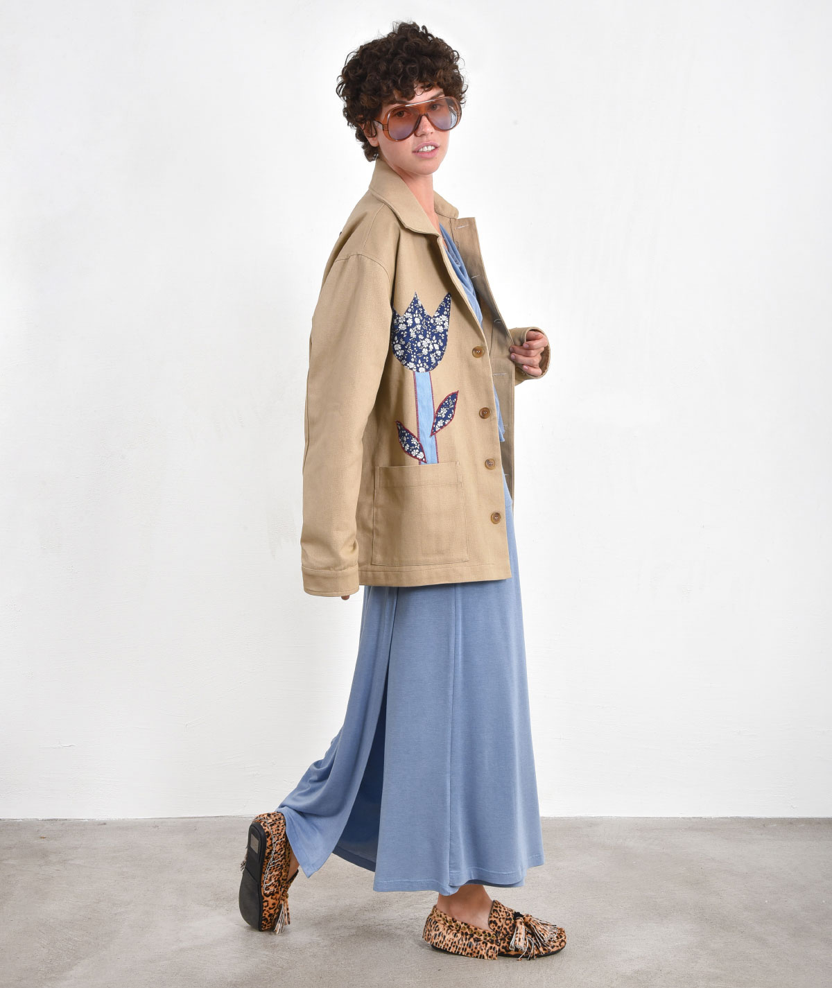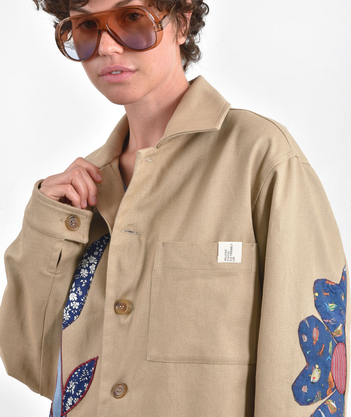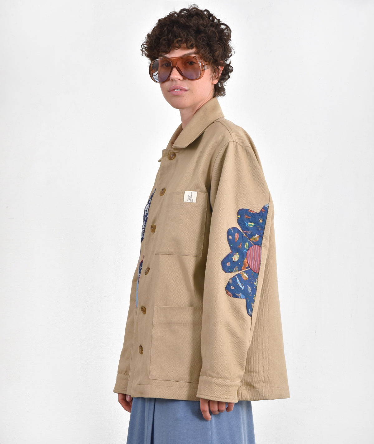 Unisex jacket crafted from premium cotton canvas, adorned with bold appliqué flowers, each hand-cut and hand-placed using leftover fabric remnants. Designed and handmade in our studio in limited quantities, it offers style, comfort, and a true statement aesthetic. A standout piece that elevates any outfit—from casual looks to more refined ensembles.